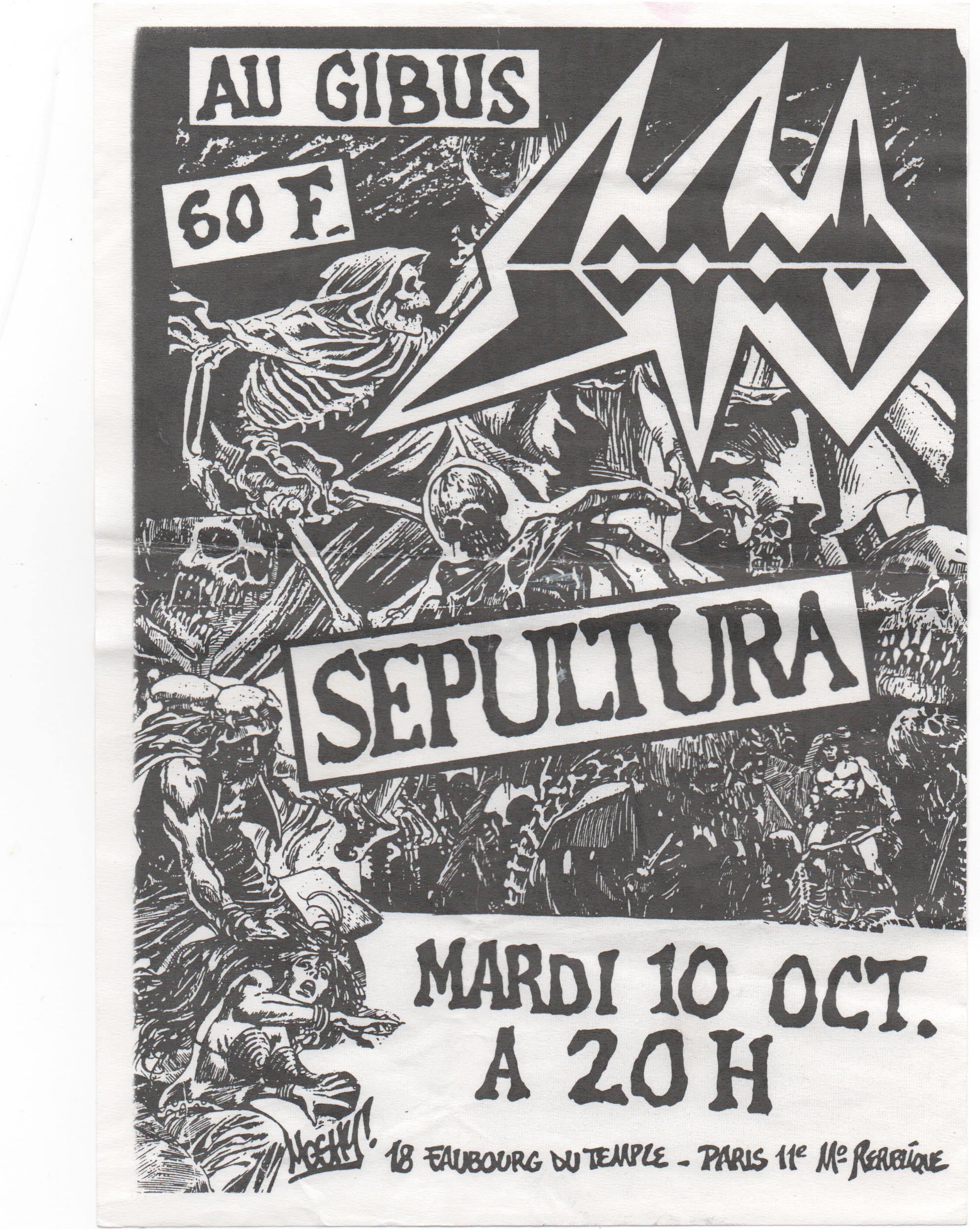Quand je suis arrivée à Paris, y’avait des concerts trash (ou pire) toutes les semaines ; et je répétais avec des gars au Liberty –déjà au LRS- qui avaient 17 ans et qui écoutaient les trucs les pires du métal à l’époque : Carcass, Nucléar Assault, DRI, Tankard, Massacra, Dark Angel, Morbid Angel, et j’en passe ; j’ai même vu Sepultura avant leur gloire internationale… Y’avait