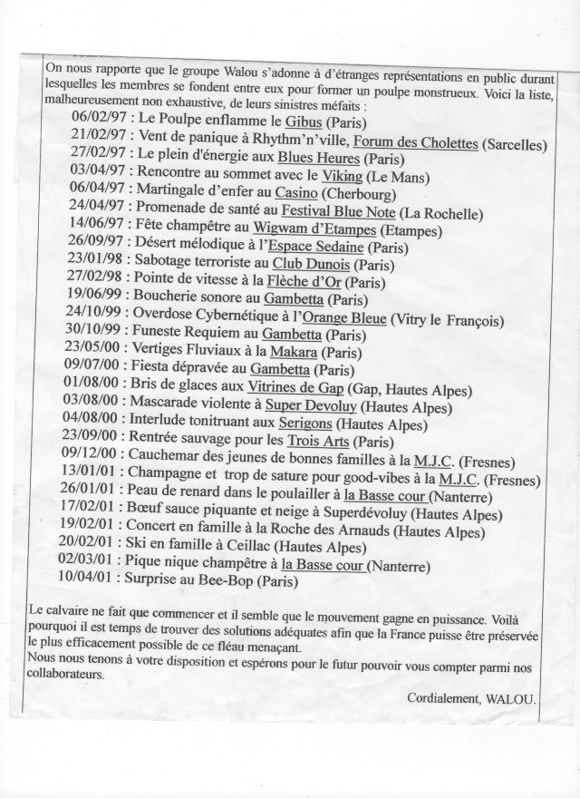 Mais c’est pas grave on est des pros (ah ah ah ) alors on enchaîne comme des fous et entre chaque morceau « clapclapclapclap » suivi d’un silence pesant. Bref on termine le show, on enchaîne, on se déchaîne, et on encaisse (3000 francs Madame ! le plus gros cachet de Walou à ce jour) et on repart difficilement pour 9h de route dans une nuit d’encre.