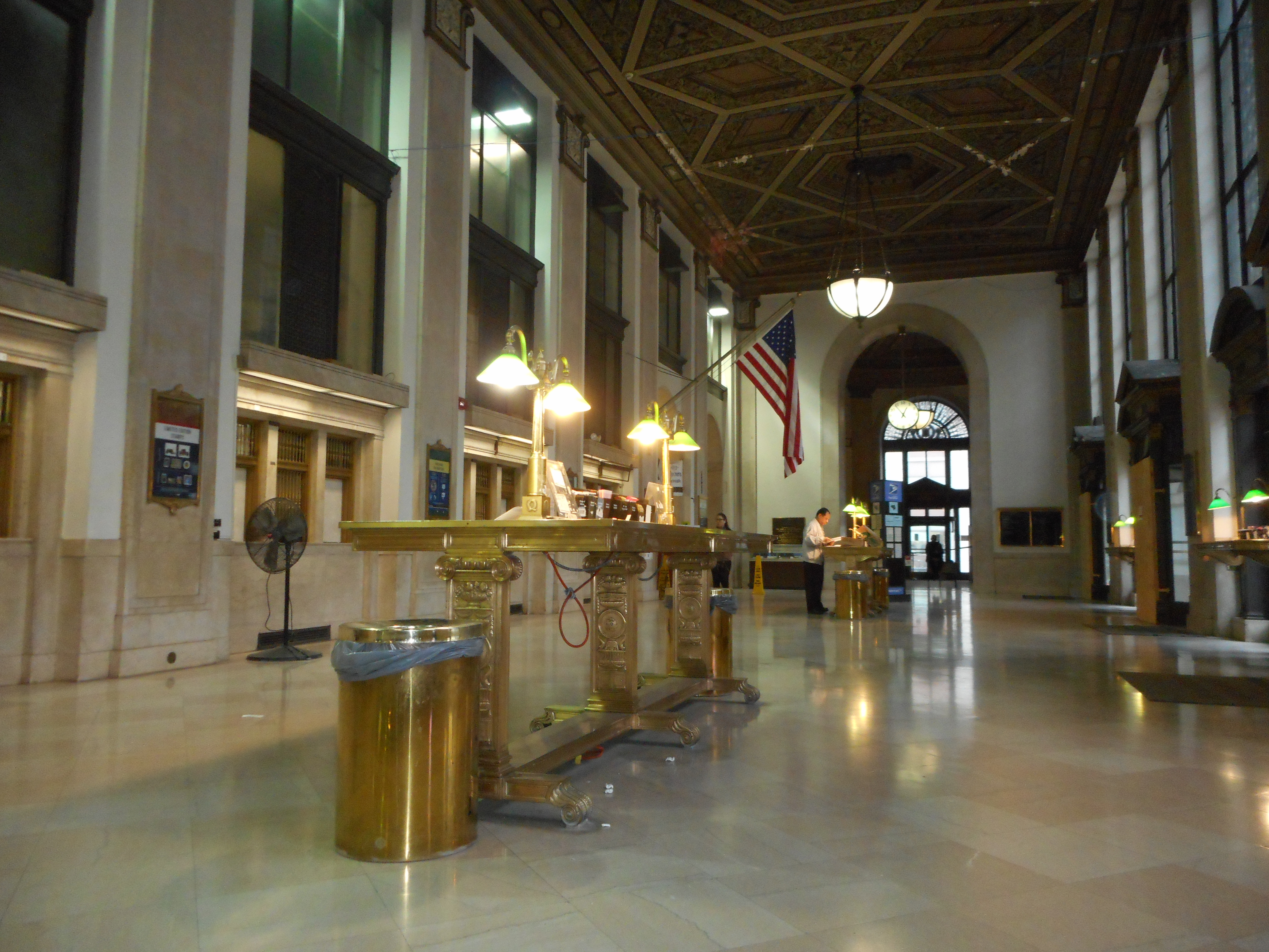 la grande poste, avec ses tables en marbre et les poubelles en cuivre, avec des lampes comme dans les westerns.