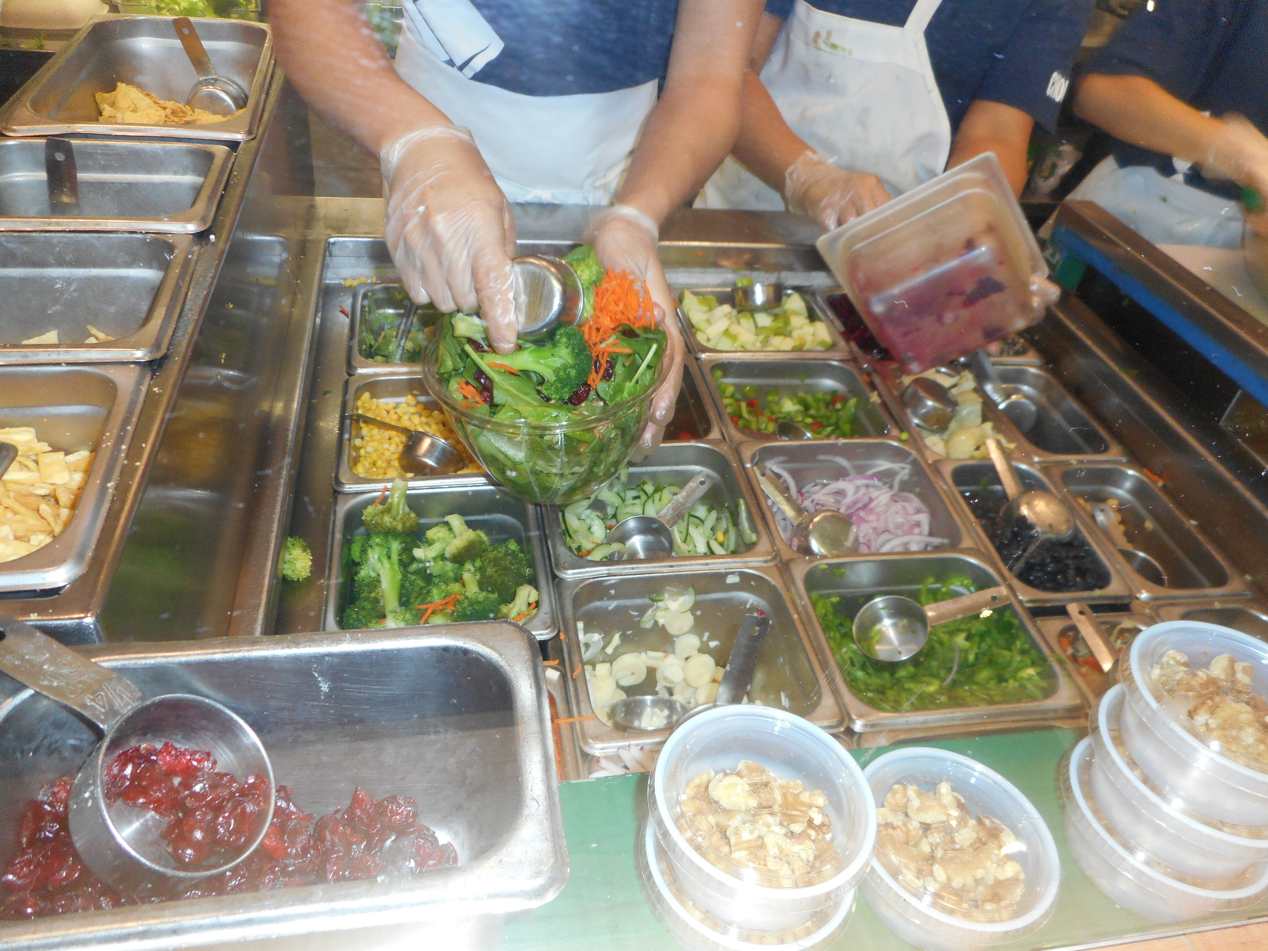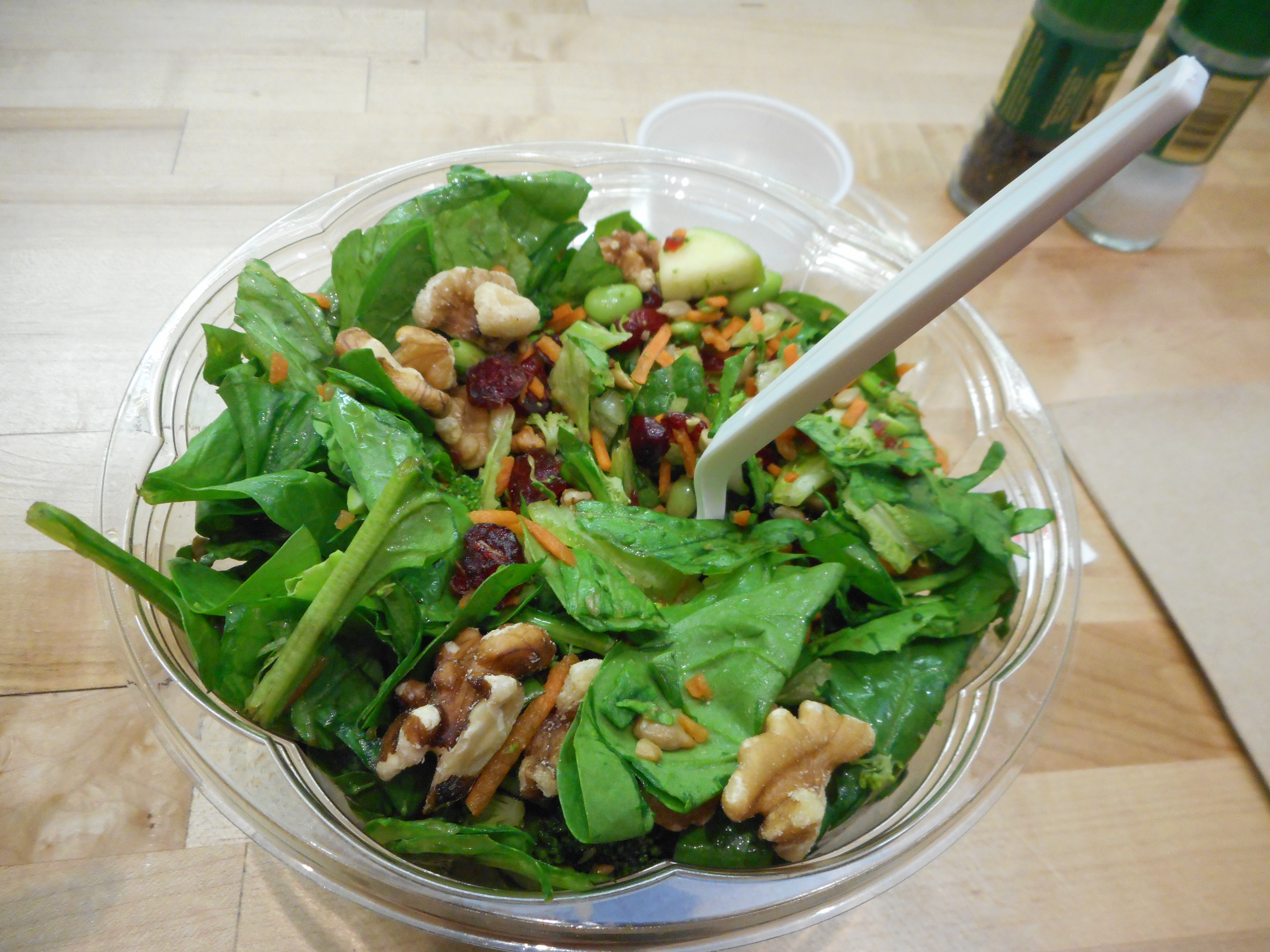 Nous avons quand même mangé une salade, préparée fraîchement et efficacement sous nos yeux (on trouve que les américains sont très efficaces, même quand il y a du monde on attend très peu)… par contre là, y’a une salade entière… (même si je fais vegan holidays y’en avait trop)