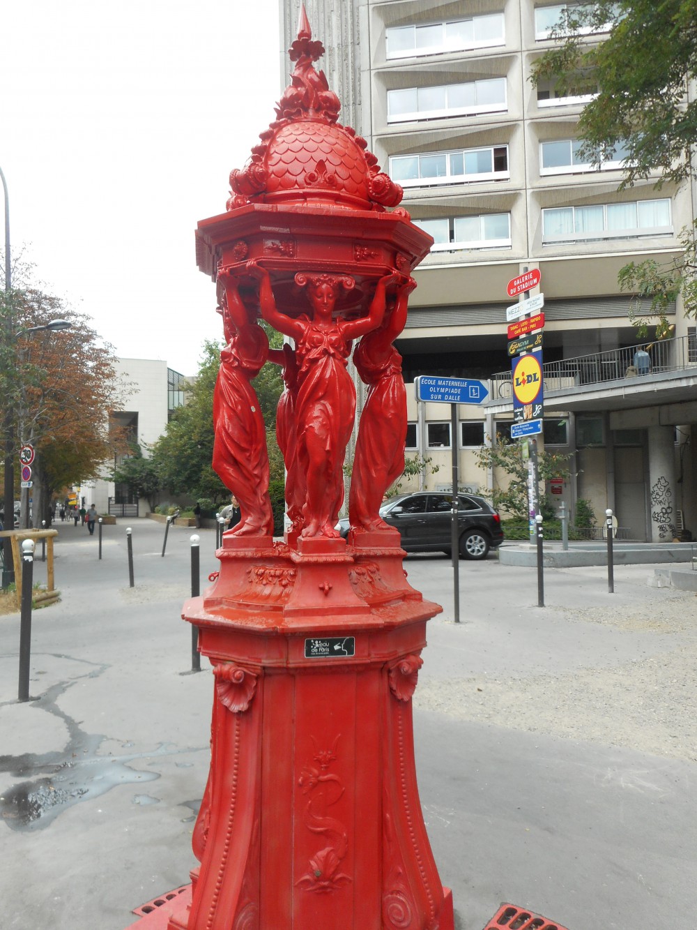 Y’en a qui peignent les traditionelles fontaines Wallace vert-foncé en rouge (avenue d’Ivry paris 13).
