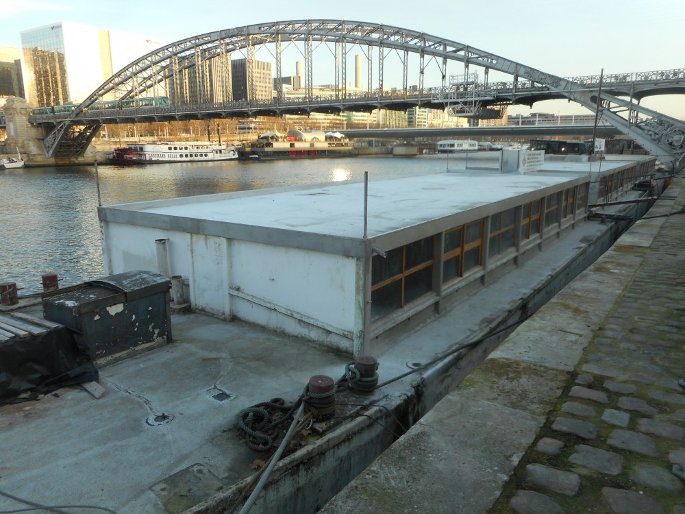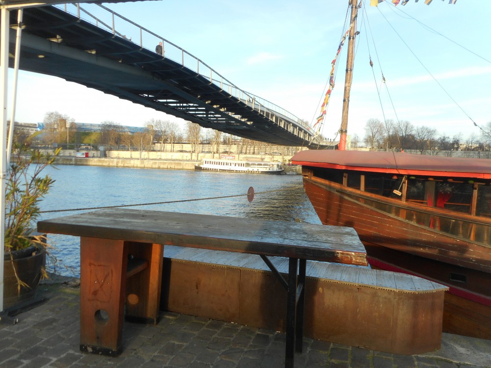 péniche Dame de Canton et passerelle Simone de Beauvoir avec table curieuse à trous en premier plan.