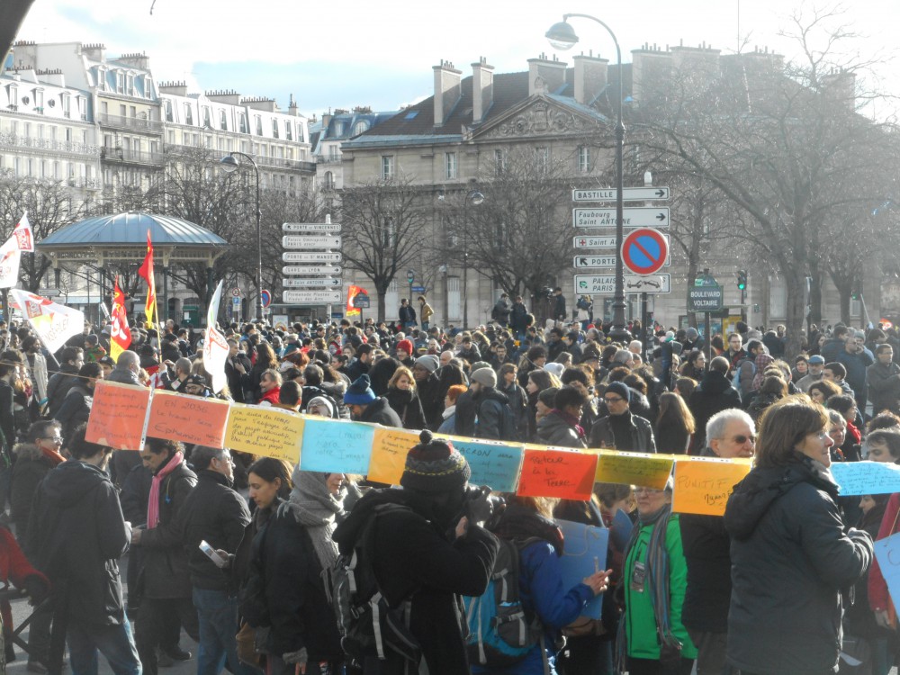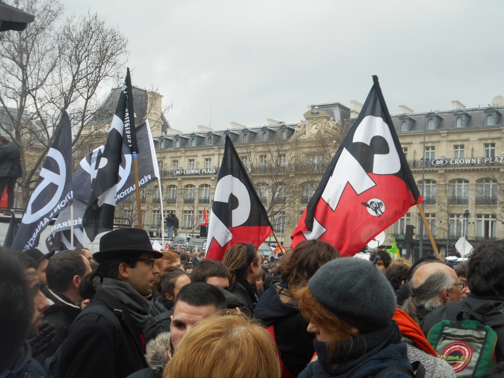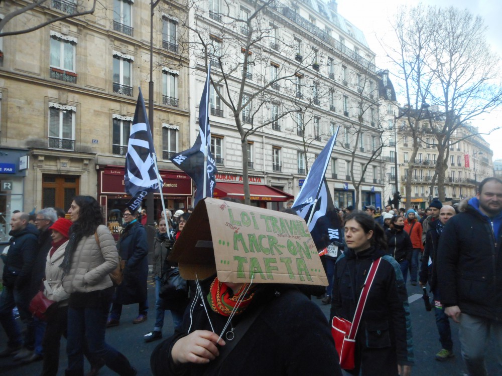 C’est la cafouille des débuts de manif… On piétine une heure sans nos potes qu’on a paumés et la CNT finit par se frayer un chemin dans le boulevard Voltaire. Ouf on respire.Y’a du monde alors en fait quand même.