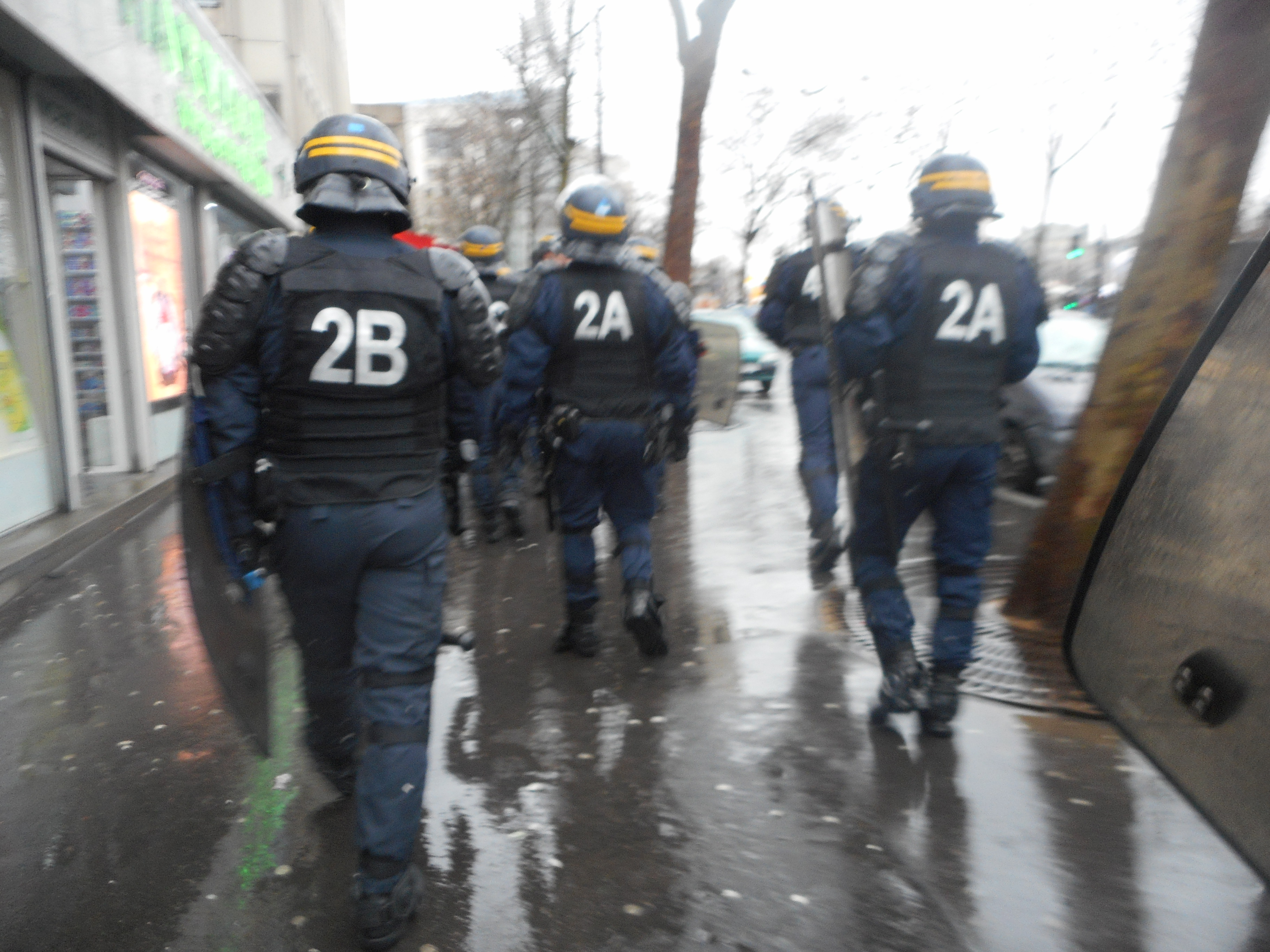 Donc, ah mais y pleut -(beaucoup en plus), j’ai RV devant le KFC (ton prochain boulot aussi) avec des copines. En attendant je rejoins Lucas qui est dans le lycée de Valente et qui me raconte par quelle magie ils ont réussi le blocage du bahut, forteresse imprenable ; c’est une tour avec des labos et des pompiers dedans… les gosses se sont bougés à 5h du mat pour faire un tas de poubelles cadenassées. Et ils ont trifouillé le truc de l’entrée à carte magnétique qui permet aux élèves d’ouvrir la porte : « … et alors il a tout pété avec un tournevis, et il a refermé pour que ça ne se voie pas »…