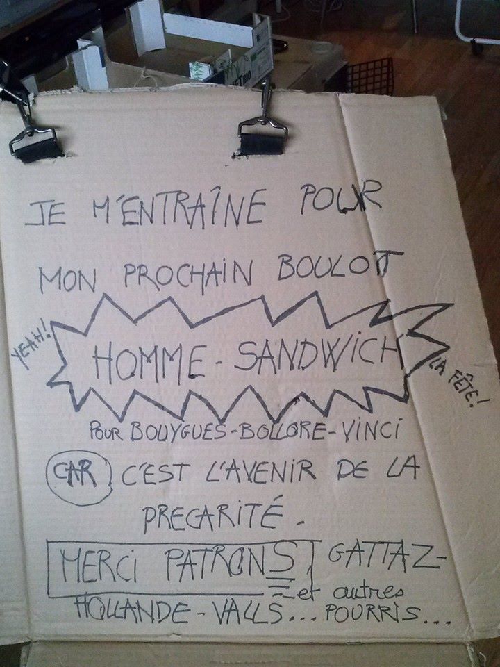 J’ai un nouveau costume en carton, et la manif part place d’Italie, je suis obligée d’y aller. J’ai été inspirée par des ricains « assistés » et qui devaient faire de la pub pour des grosses boîtes d’enfoirés, au milieu d’une 4 voies à 10 dollars la journée.