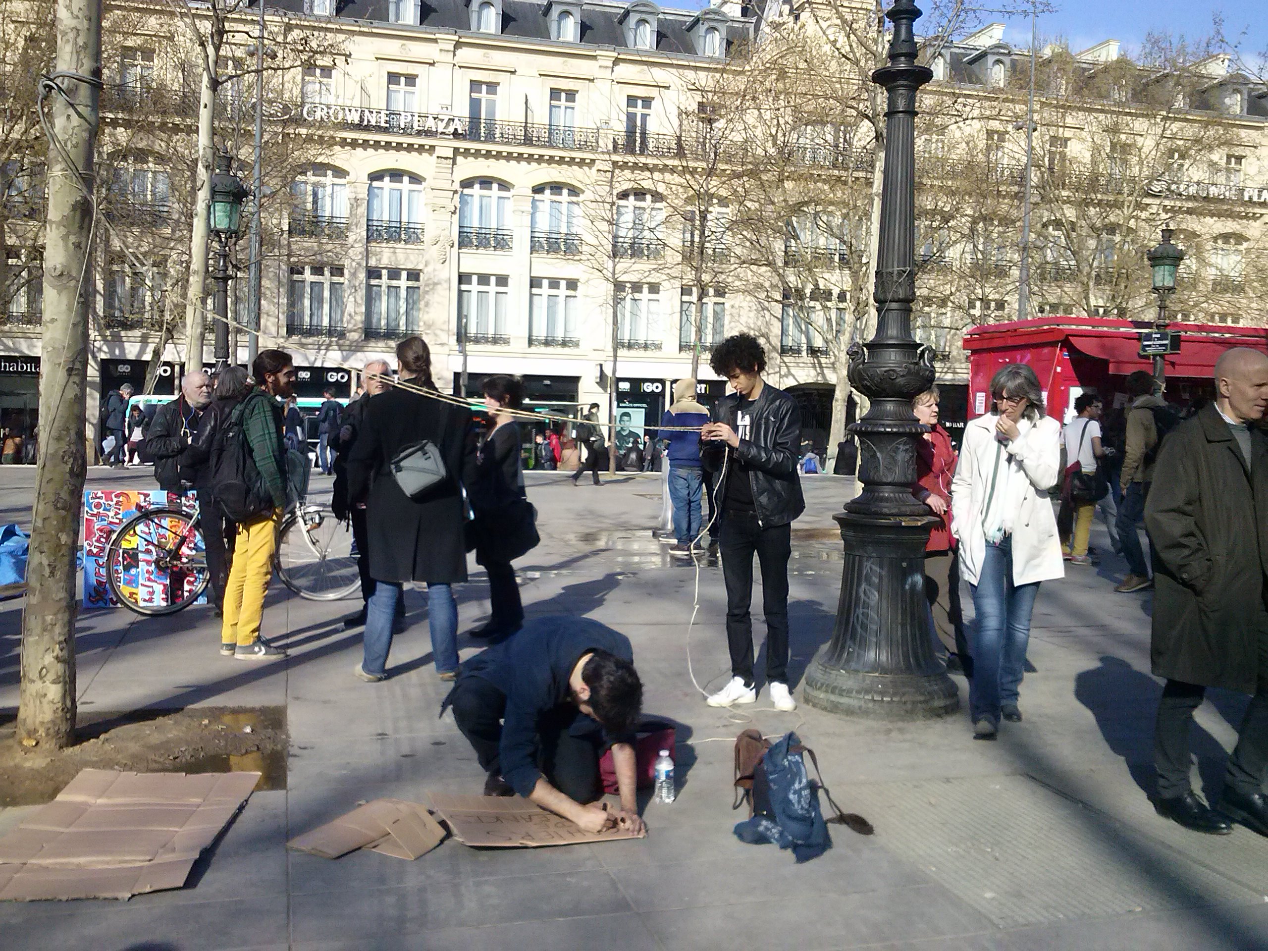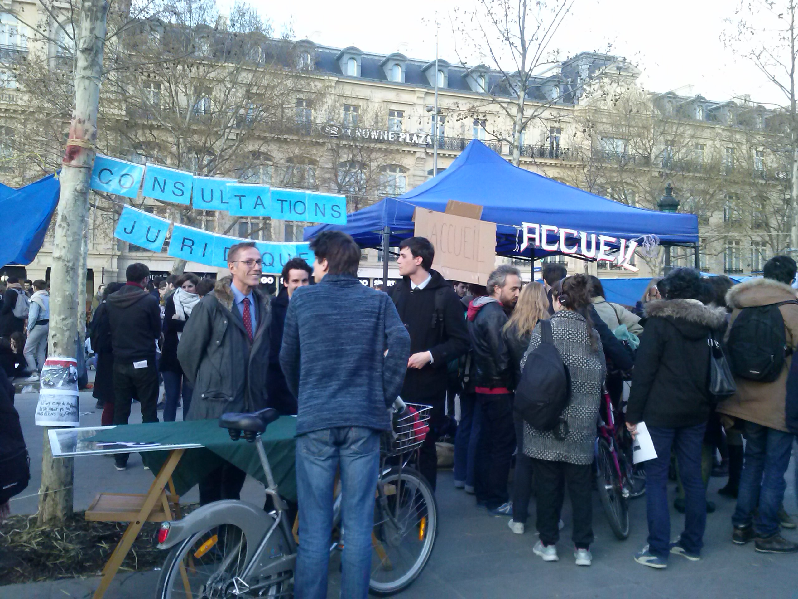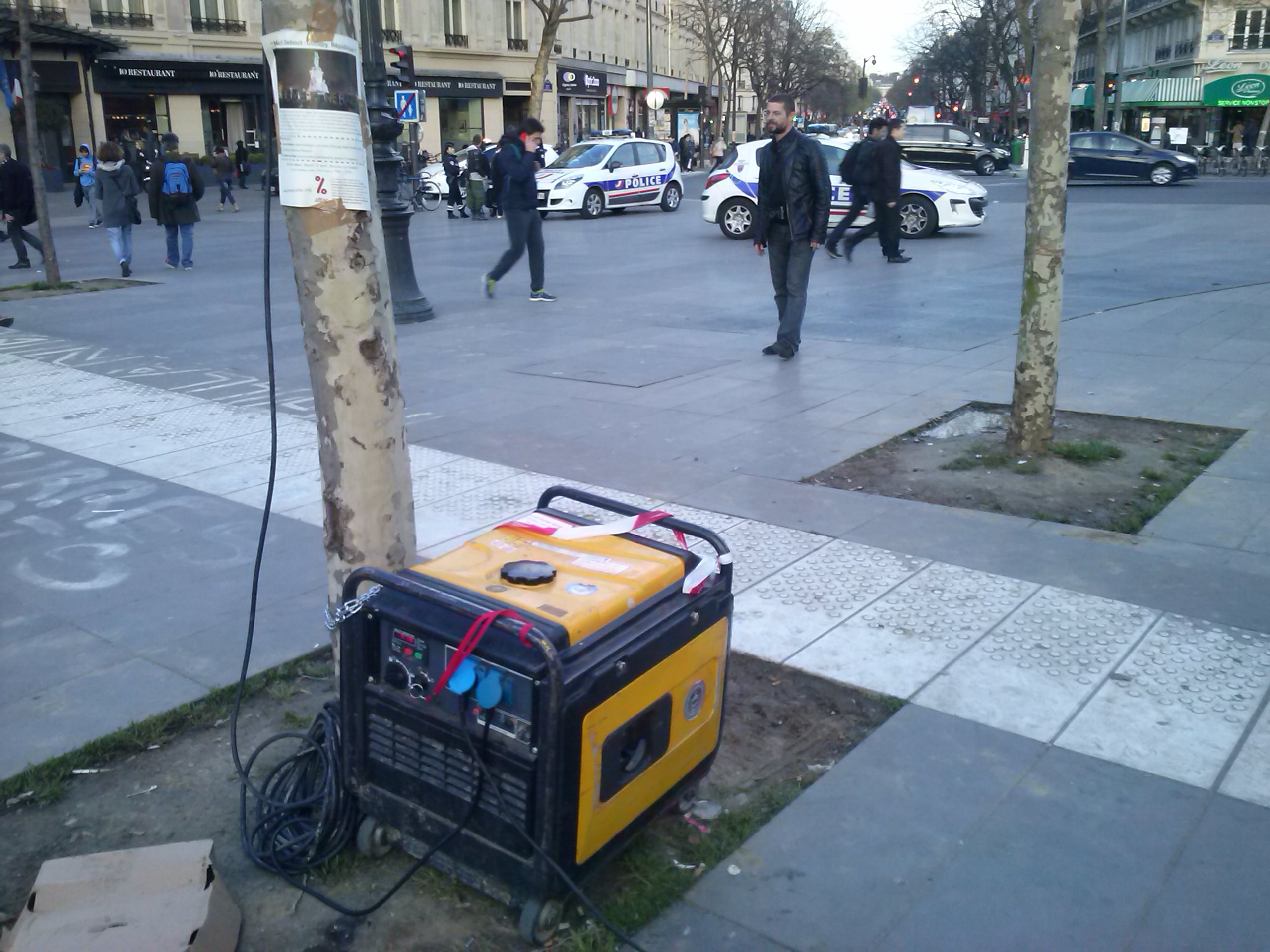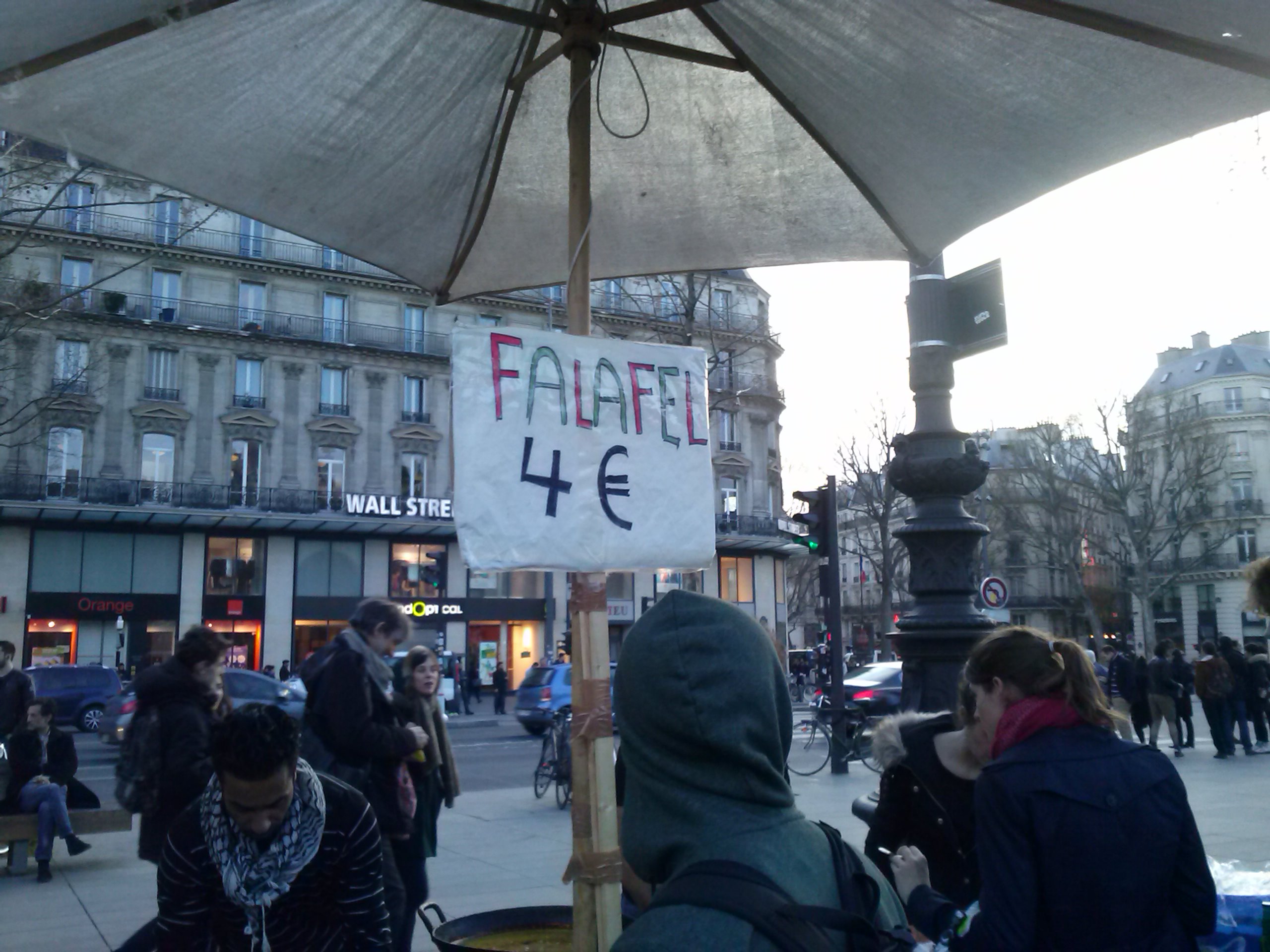 Chacun en profite pour vendre sa soupe (mais je ne suis toujours pas sûre qu’ils partagent avec Nuit debout), les merguez sont plutôt vers la rue du faubourg du temple, (une intervenante pendant l’A.G explique qu’un accord avec les flics, permet de faire en sorte « qu’il y’en ait moins, car ils vendent de la bière et en conséquence il y a eu les débordements de samedi « (comprendre les mecs bourrés ingérables) à éviter dorénavant.