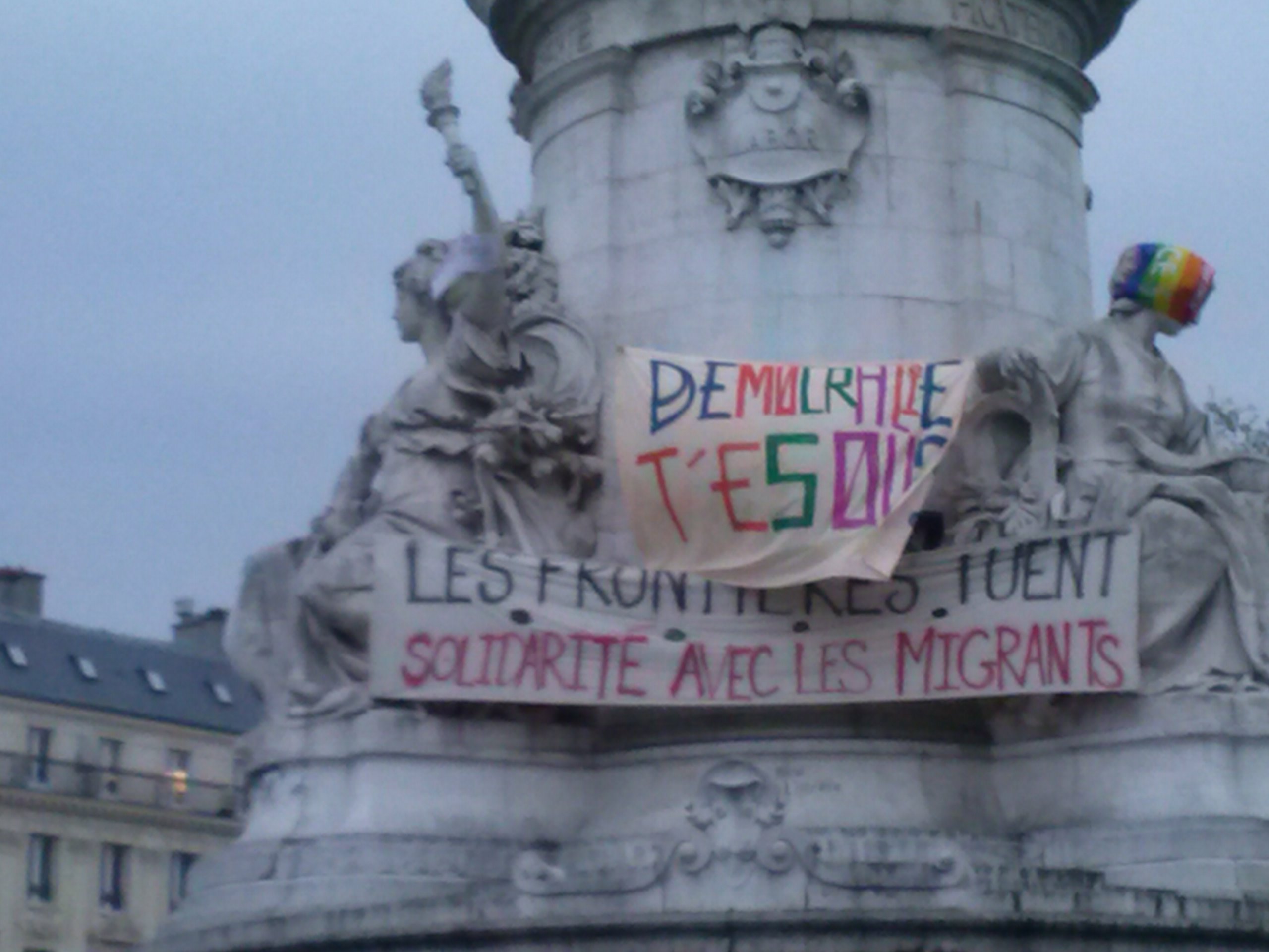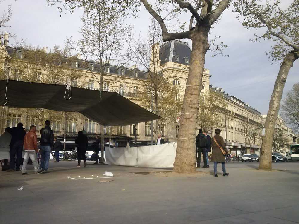 Il n’y a aucune communication : sur la place il y a une comm’ réfugiés avec Hasna toujours vénèr, une comm’ migrations avec deux juristes calées, un groupe qui fait des razzias go sport à l’arrache, une dame qui se balade avec un carton commission migrants mineurs, et des nouveaux depuis deux jours qui font une collecte. Aucun d’entre eux ne connait l’existence des autres, alors j’essaie de faire le lien « et sinon tu sais que… ? » mais y’a des réfractaires. Même des agressifs.