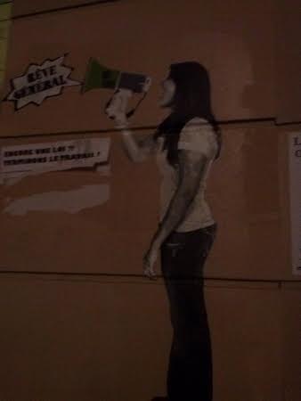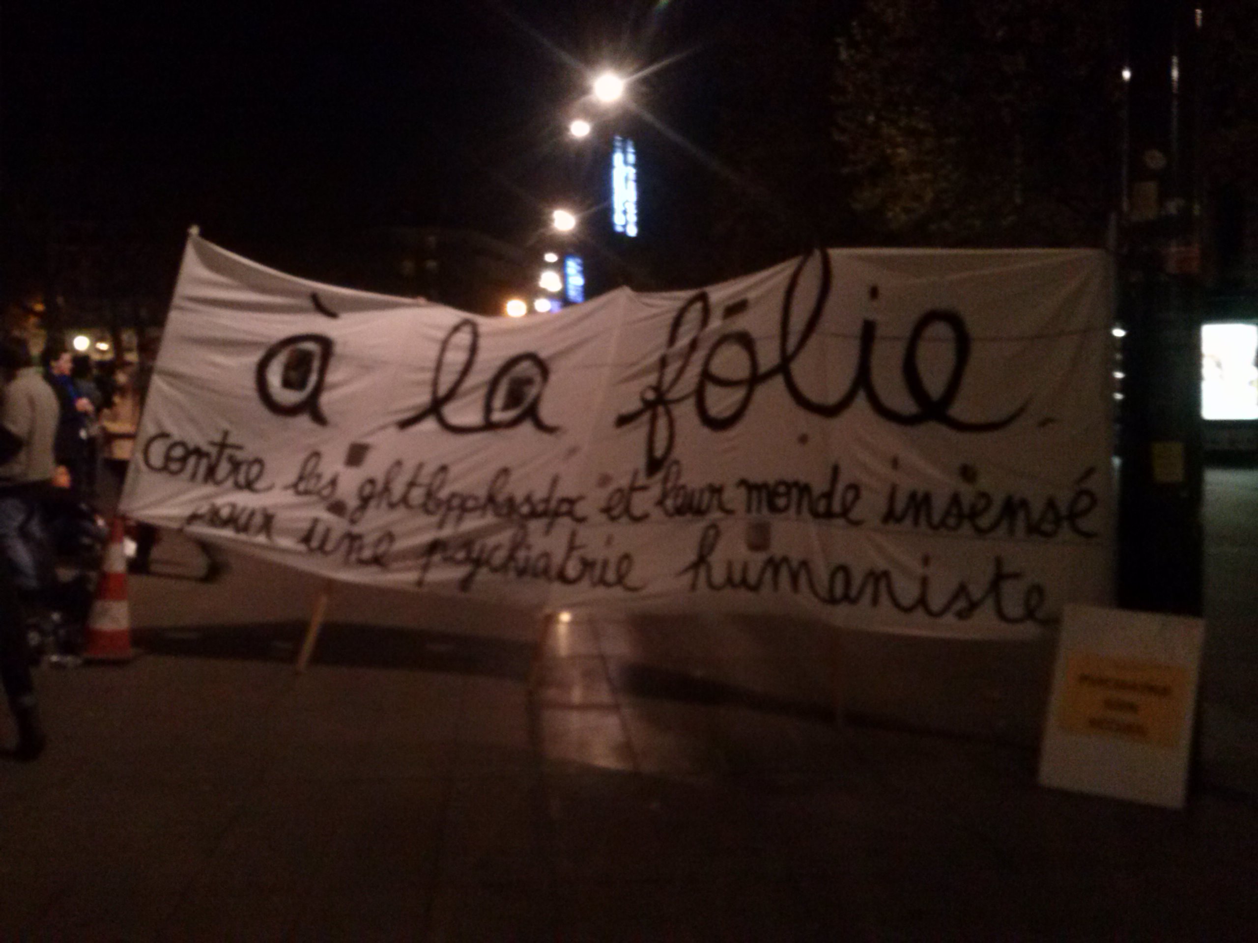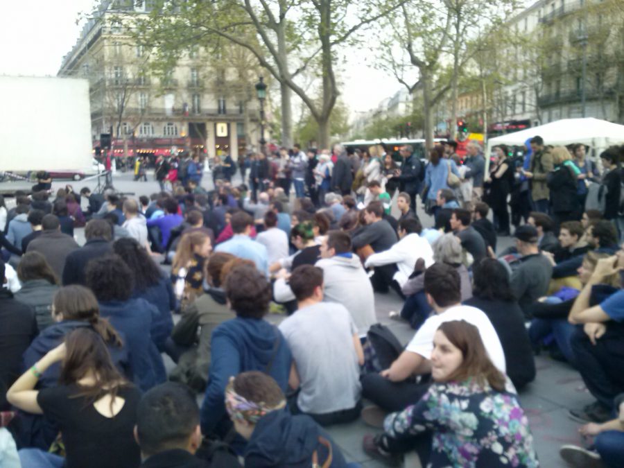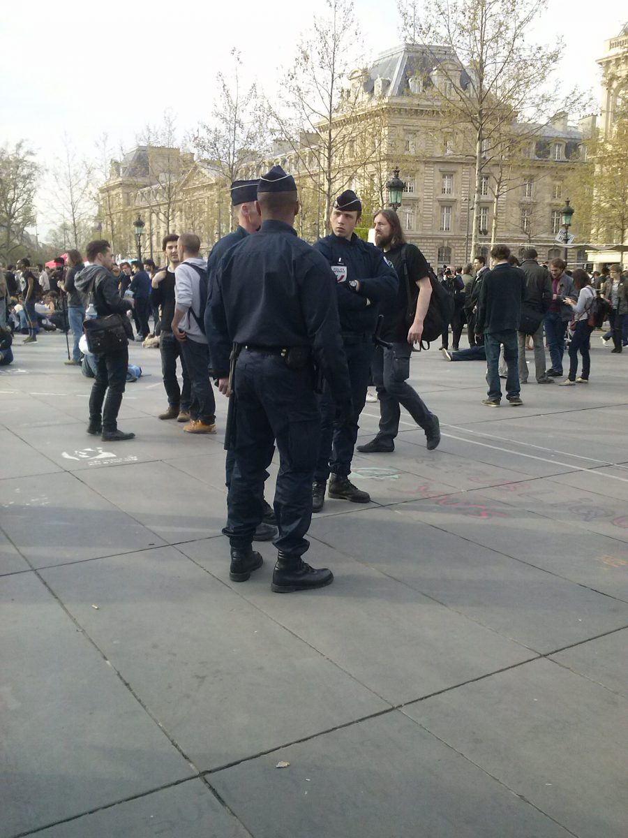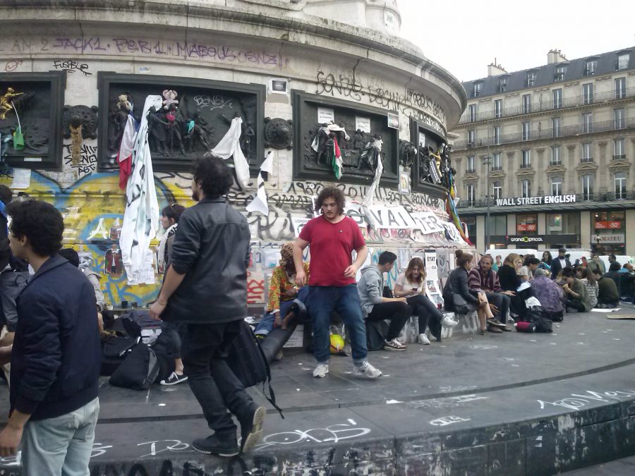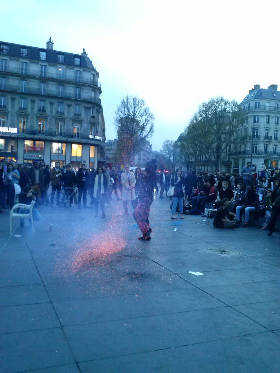 Ensuite je fais un tour de place en attendant le film, mais l’Assemblée populaire s’éternise, du coup je regarde et je vois à gauche les restos du cœur qui mettent un e barrière, le casse-couille avec sa technomobile, à droite des joueurs de djembé avec un danseur drôlement inhibé…