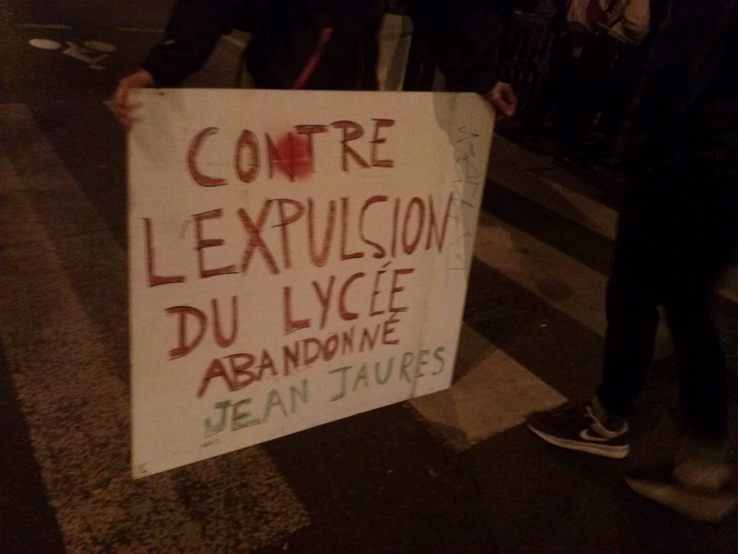 J’attends des potes, on va boire un demi aux troquet des buttes-chaumont, et quand on repasse au lycée, y’a déjà moins de gens, mais des jeunes gens ont fait une barricade avec une palette et deux panneaux au croisement Bolivar / Pradier.