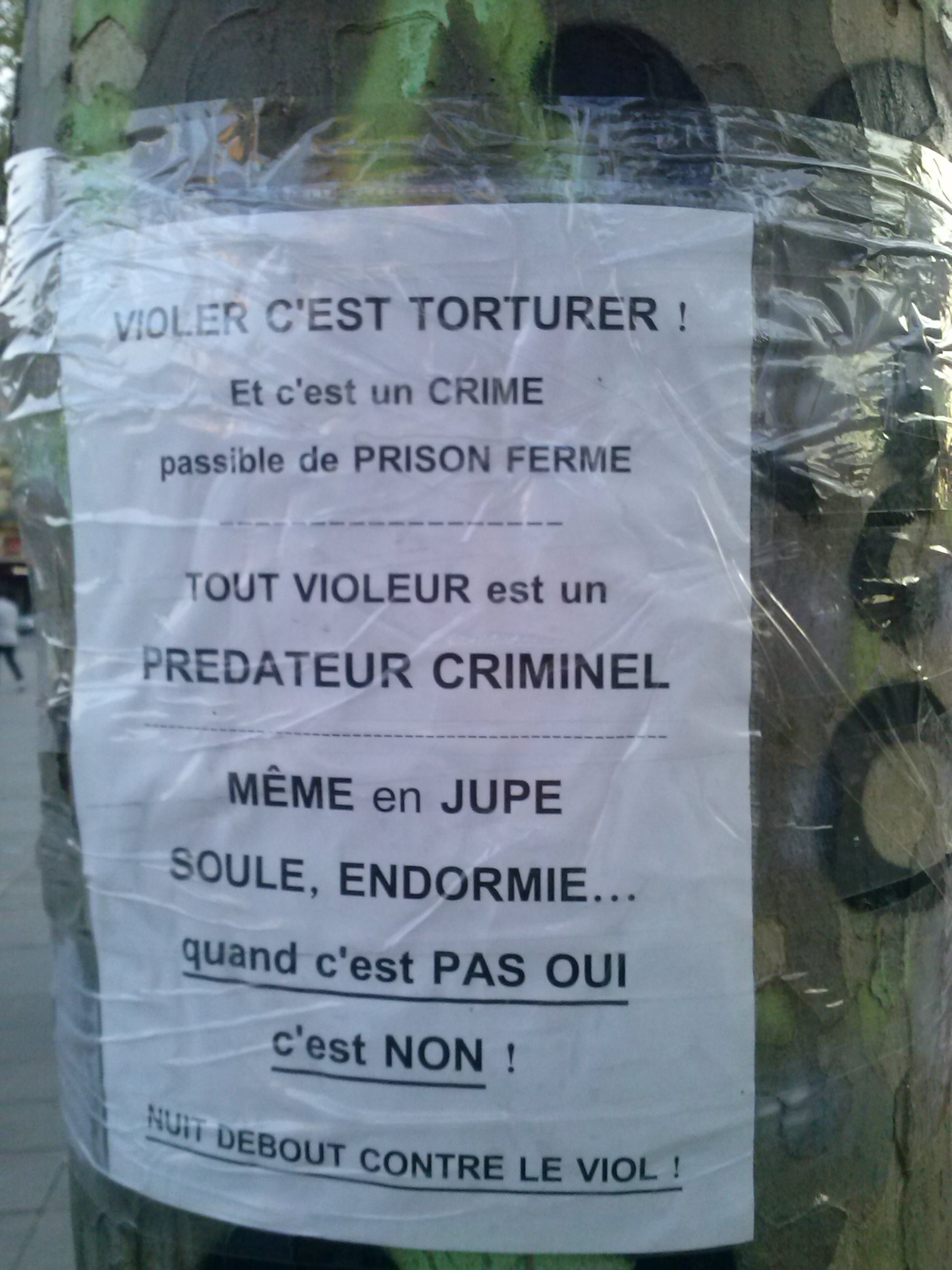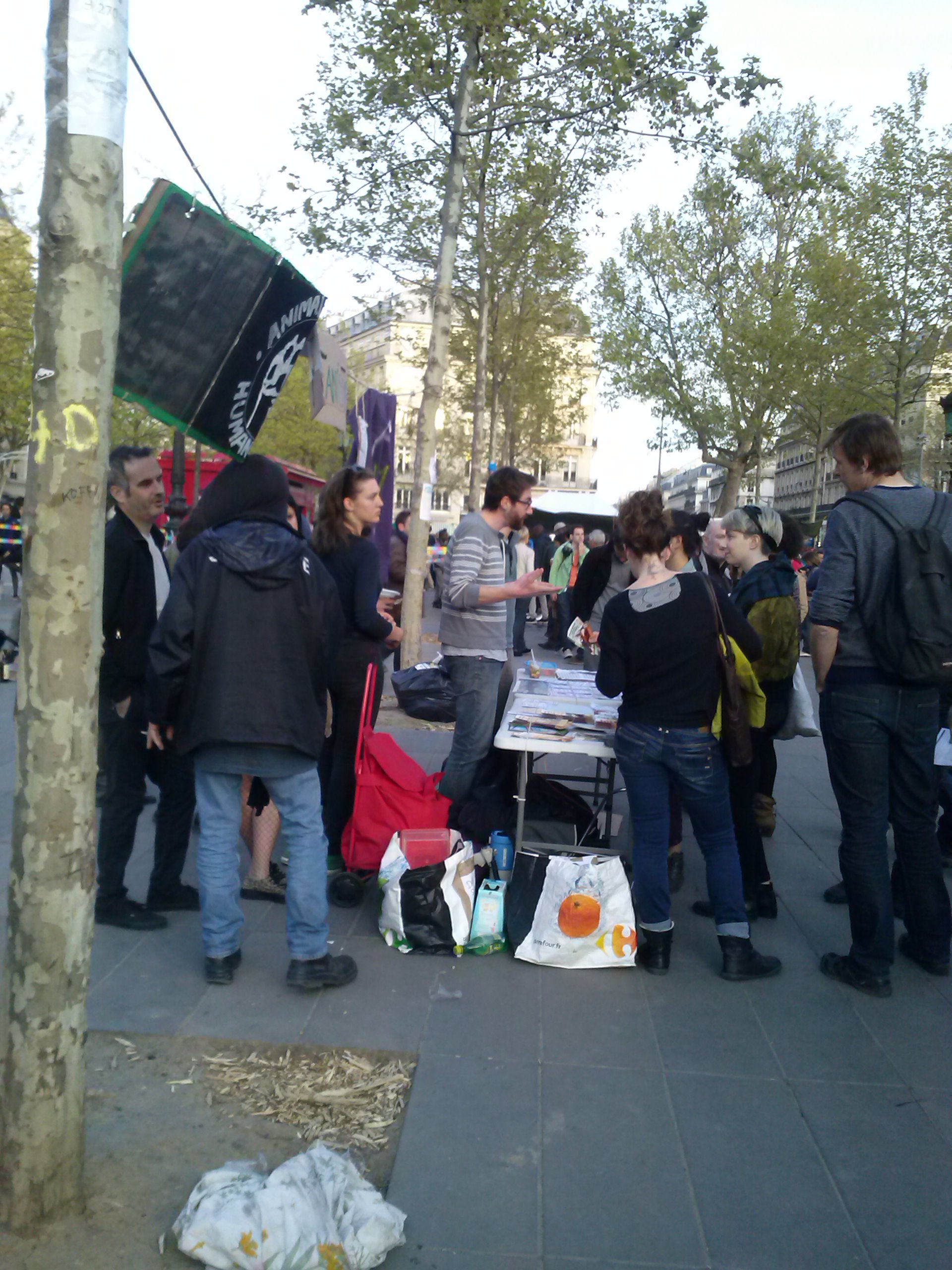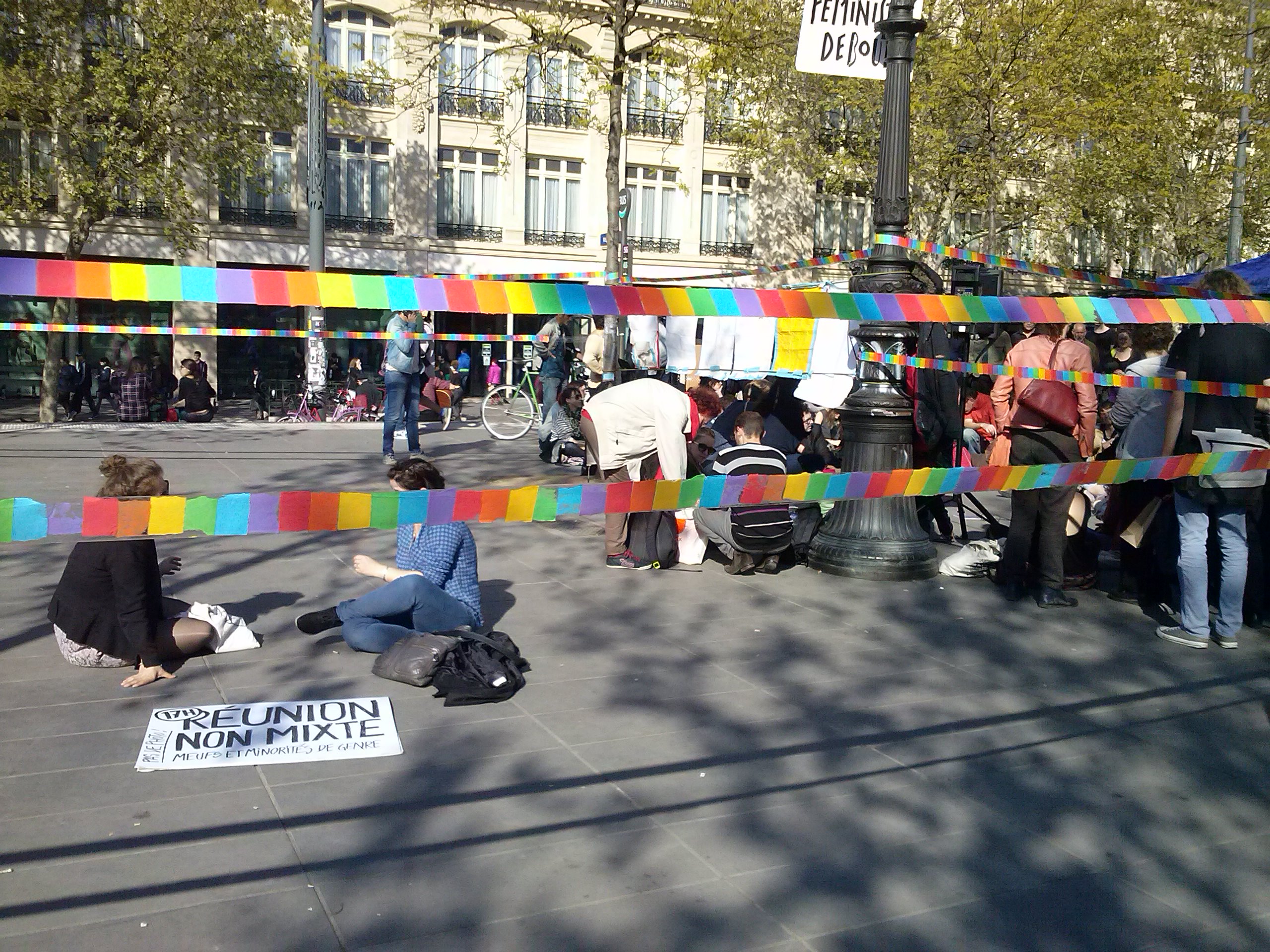 Ah ça marche pas fort le non mixte, je vais y aller. Du coup c’est naze, il se dit pas grand-chose dans cette commission, une meuf hystéro vient nous dire qu’elle s’est fait violer trois fois (ici-même), et qu’elle veut qu’on passe à l’action au lieu de blablater, par exemple « quand est-ce qu’on coupe les couilles des mecs » euh personne ne fait marionnettes, et on la renvoie à une journaliste qui voulait du sensationnel à propos des viols commis. Je crois bien que viols est ici employé pour tripotage intempestif pas des mecs bourrés en fin de soirée. Faut dire qu’en plus du tas de gens réfléchis et des commissions, il y a toutes sortes d’azimutés sur cette place, dont des mecs bourrés le soir, qui font chier, (mais c’est pas très nouveau)… en réponse, on nous propose des cours de self-défense et des sifflets pour quand ça arrive. Je dis rien du tout même si y a pas de mecs oppresseurs, je trouve qu’il y a deux grandes gueules filles qui laissent pas vraiment l’occase…