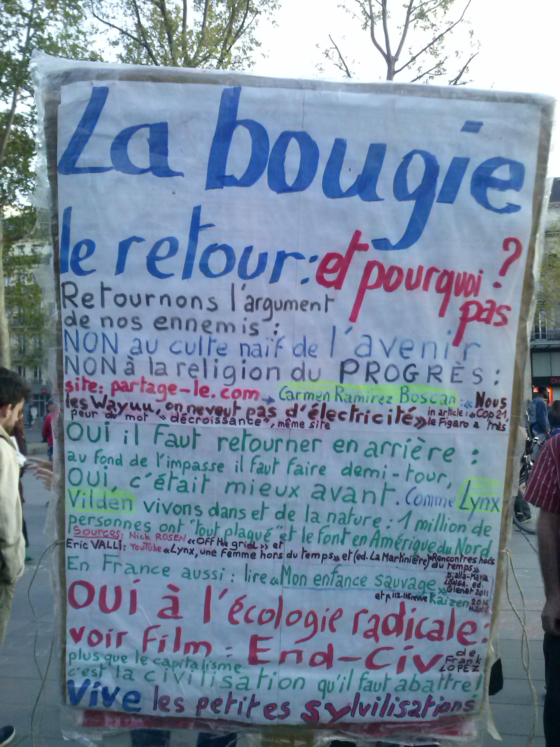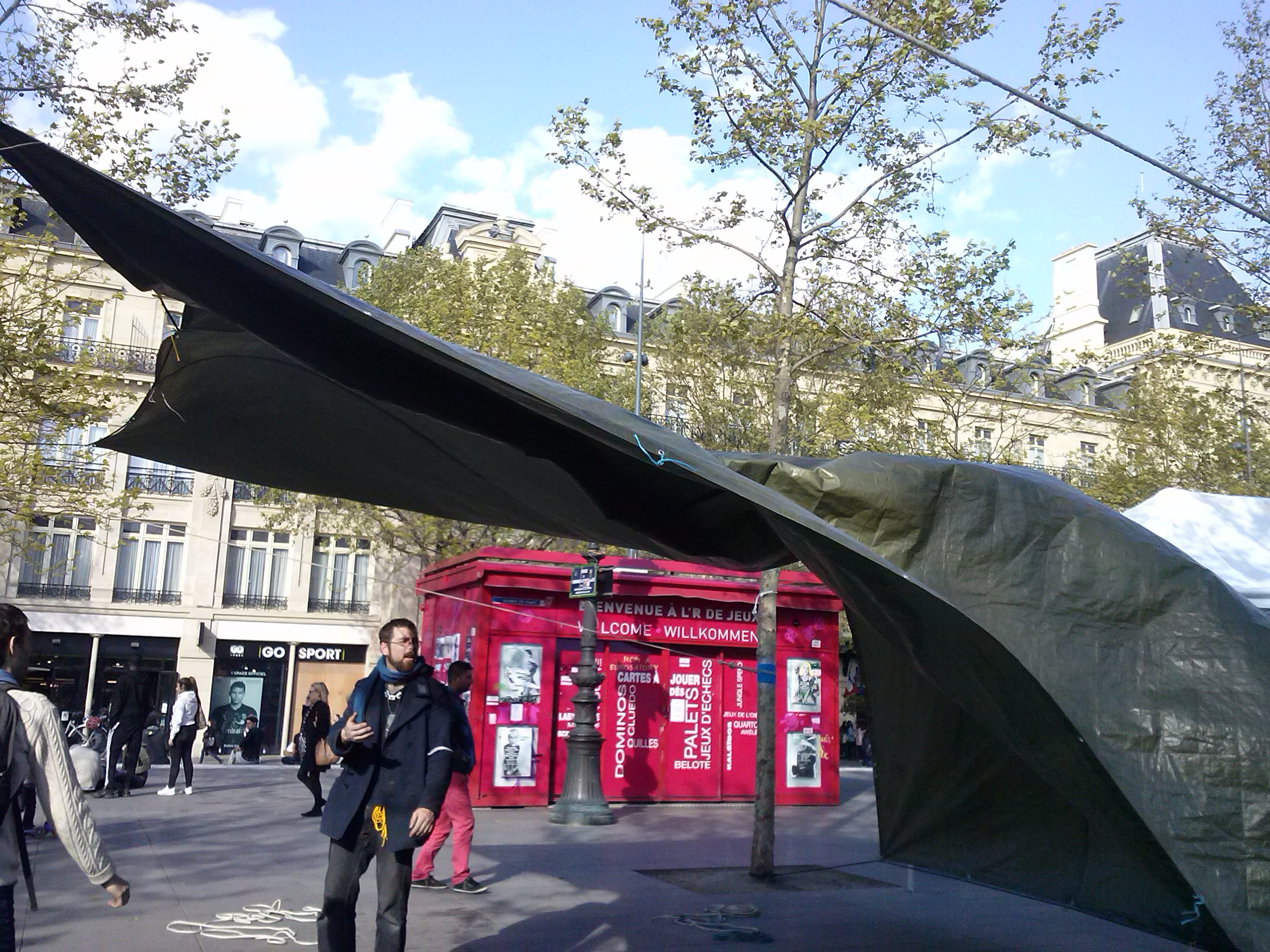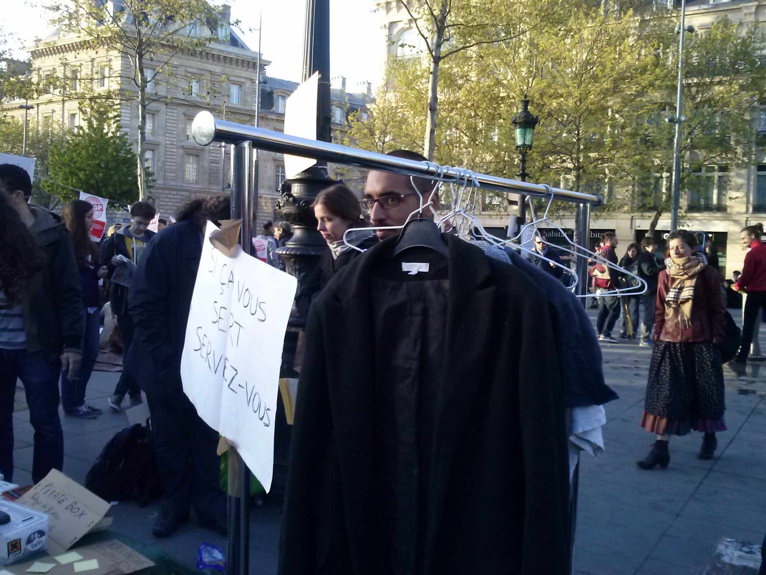 Ah ça marche pas fort le non mixte, je vais y aller. Du coup c’est naze, il se dit pas grand-chose dans cette commission, une meuf hystéro vient nous dire qu’elle s’est fait violer trois fois (ici-même), et qu’elle veut qu’on passe à l’action au lieu de blablater, par exemple « quand est-ce qu’on coupe les couilles des mecs » euh personne ne fait marionnettes, et on la renvoie à une journaliste qui voulait du sensationnel à propos des viols commis. Je crois bien que viols est ici employé pour tripotage intempestif pas des mecs bourrés en fin de soirée. Faut dire qu’en plus du tas de gens réfléchis et des commissions, il y a toutes sortes d’azimutés sur cette place, dont des mecs bourrés le soir, qui font chier, (mais c’est pas très nouveau)… en réponse, on nous propose des cours de self-défense et des sifflets pour quand ça arrive. Je dis rien du tout même si y a pas de mecs oppresseurs, je trouve qu’il y a deux grandes gueules filles qui laissent pas vraiment l’occase…