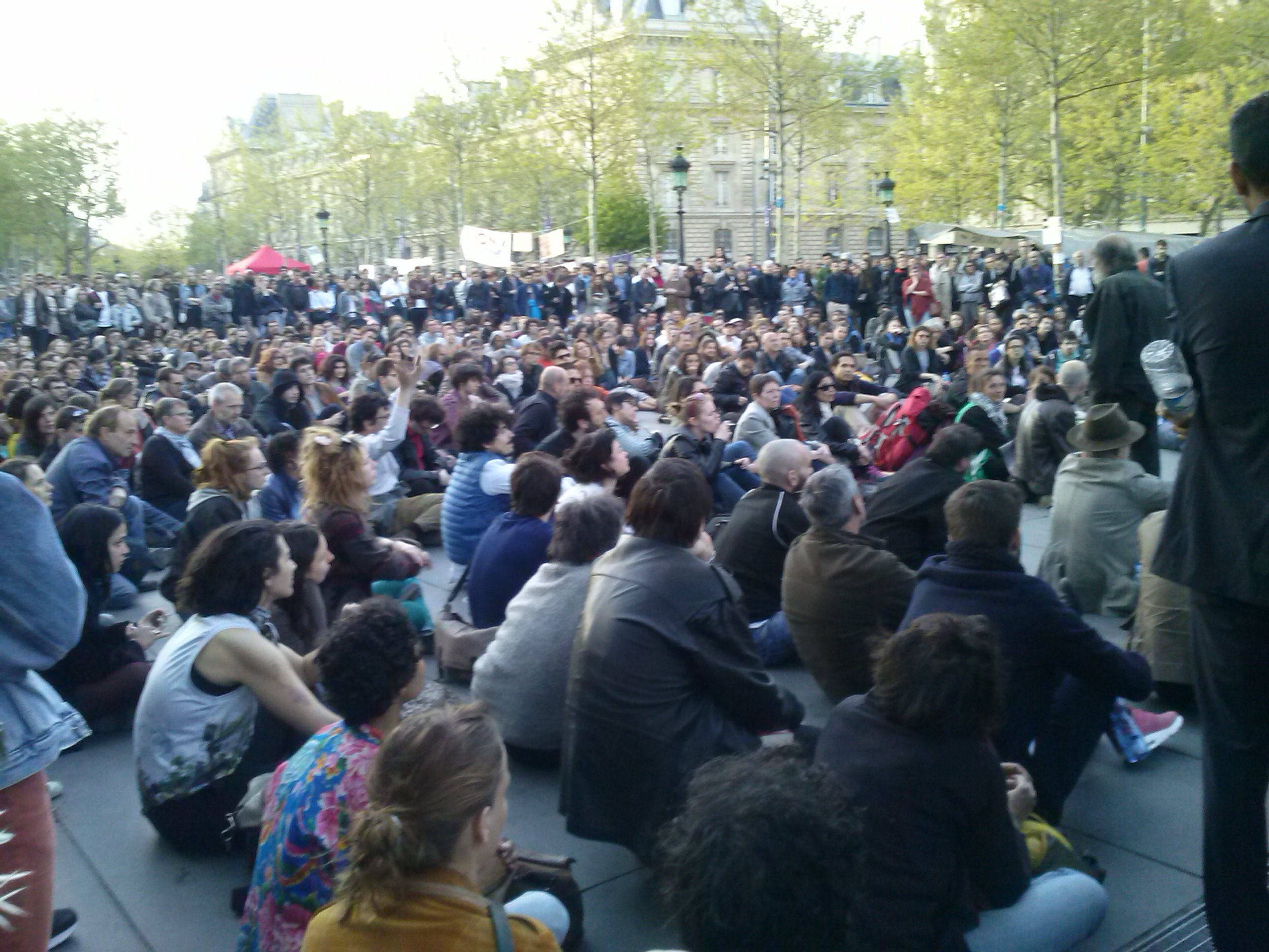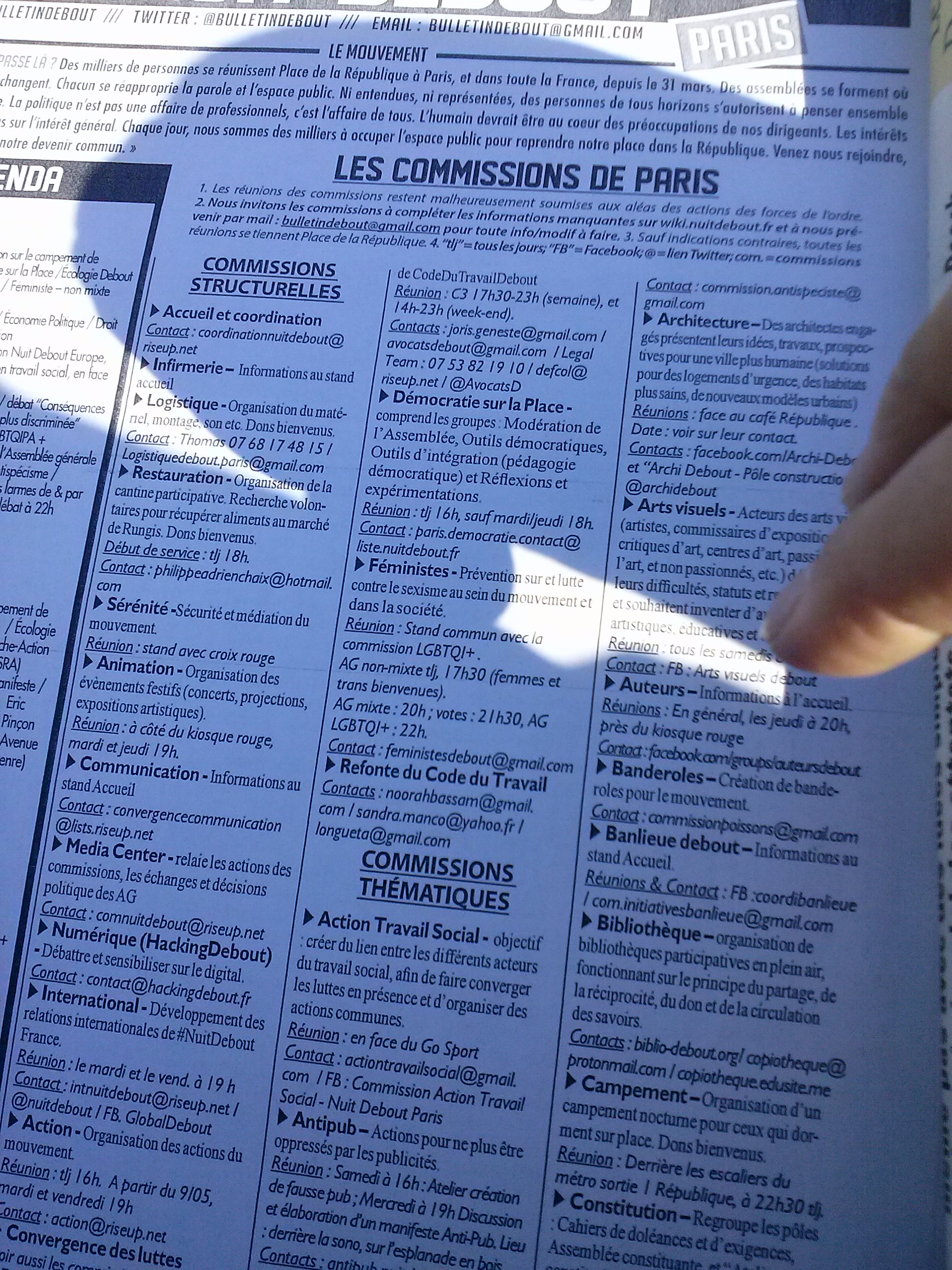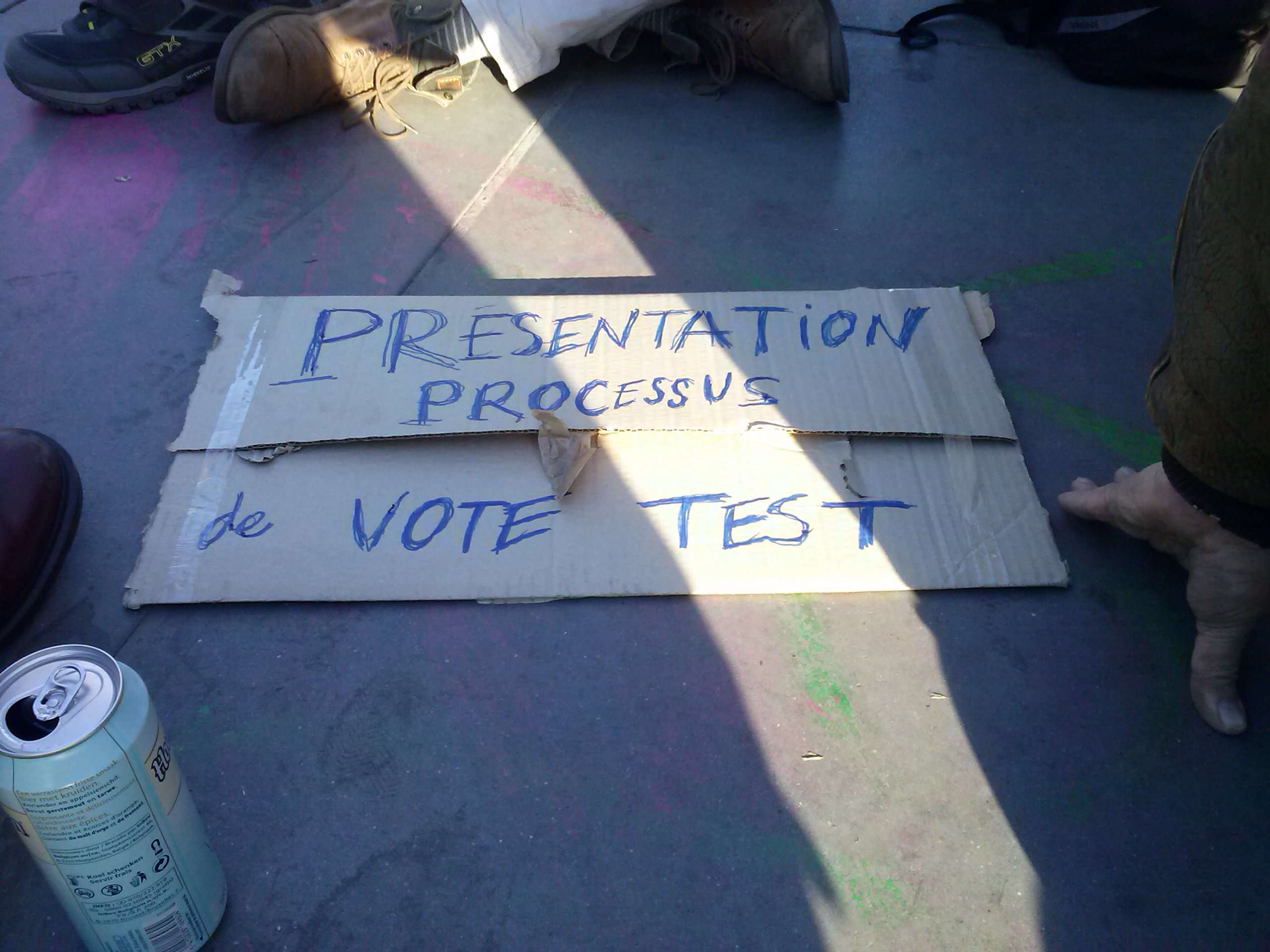 Ah voilà ! je vais à la comm’ vote test, pas mal ! les gens ont réfléchi à comment voter pour des grandes lignes qui rassemblent les gens de Nuit Debout. Il s’agit de réfléchir, par exemple, nuit debout est anticapitaliste oui ou non ? afin de créer des sous commissions qui débattent de comment on fait pour rester unis et démocratiques. On fait un test dimanche à l’AG extraordinaire, et on voit.