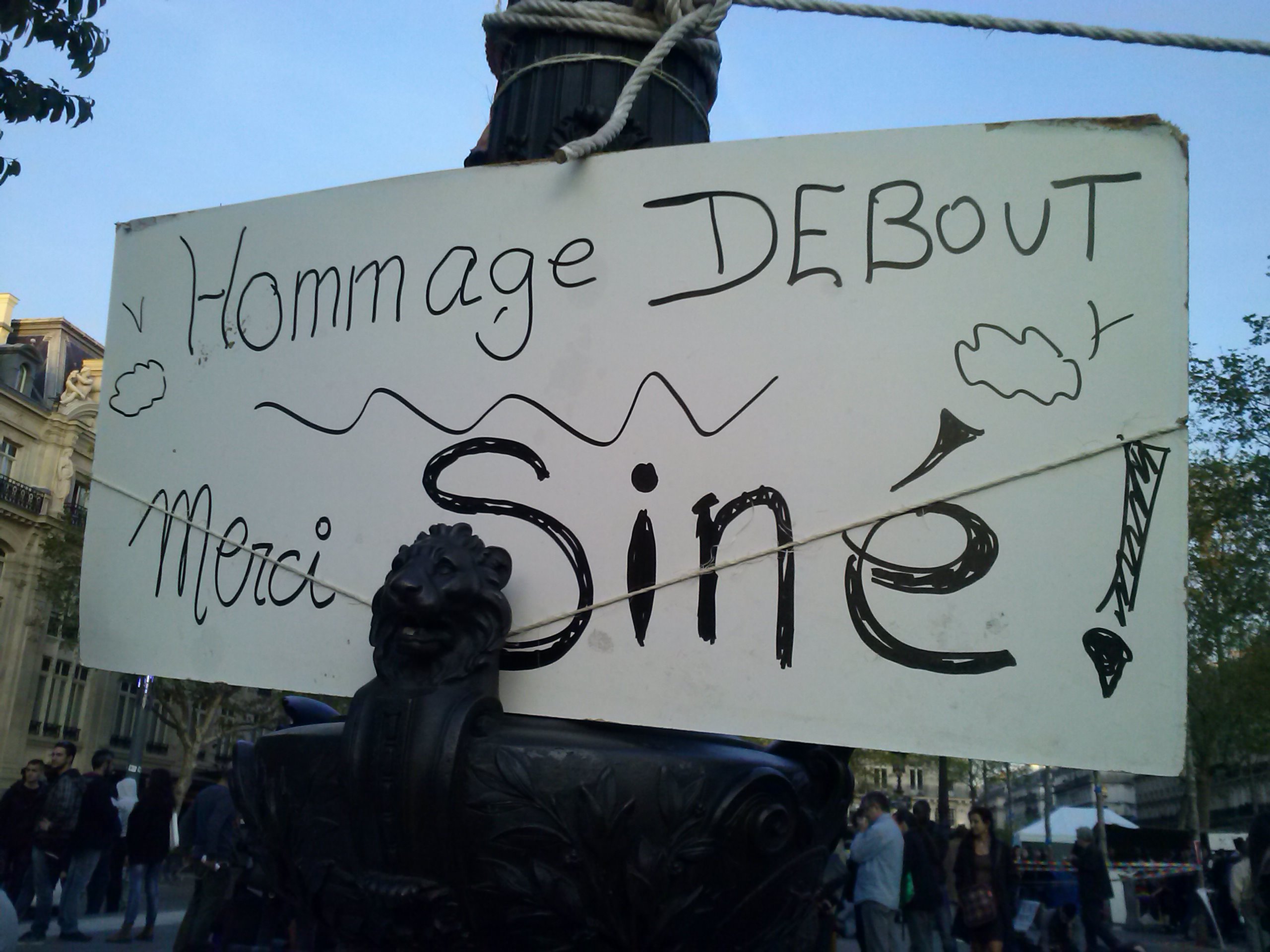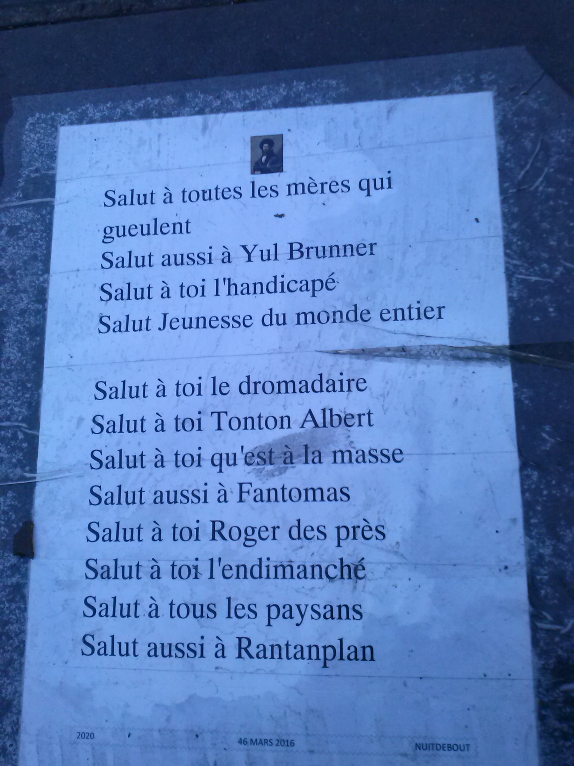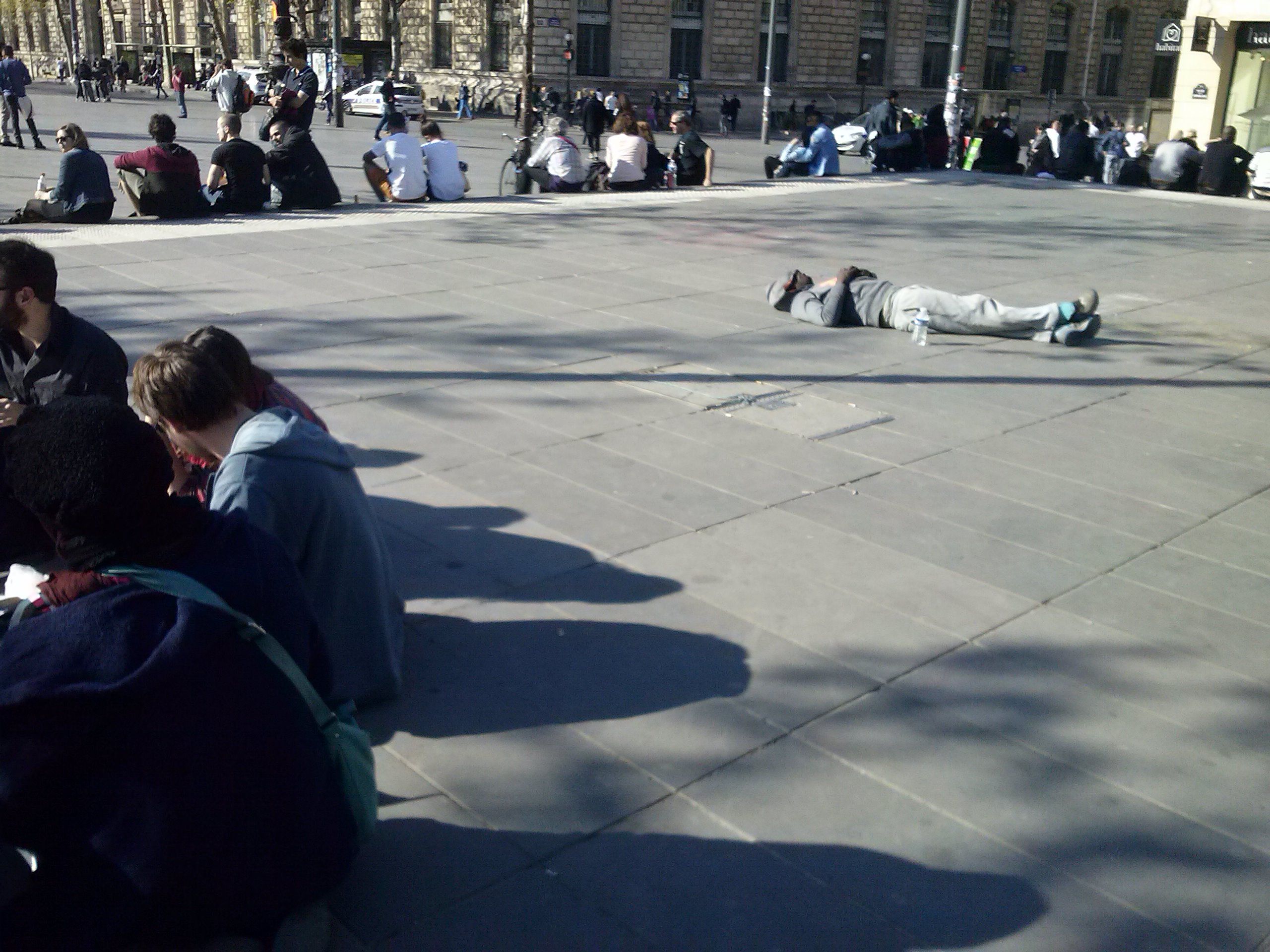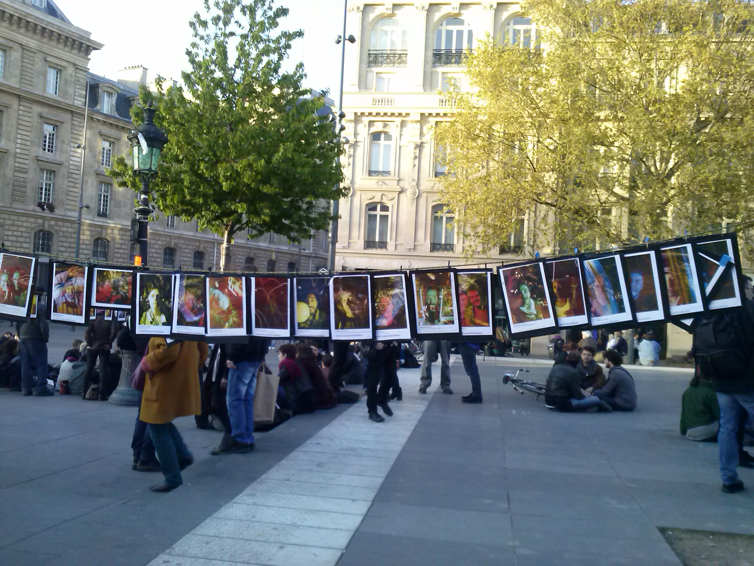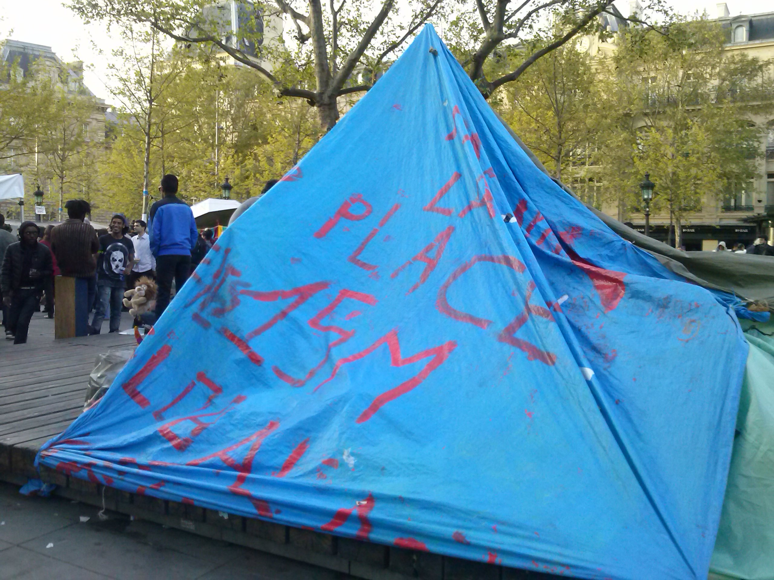 Là ça craint, je viens de recevoir un texto de la comm’ migrants, ils veulent refuser l’accord de la préf’ qui nous accorde 18h/ minuit la rep’ et faire un sitt-in à minuit pour braver l’autorité ce soir (on est pas lourds, samedi me semble plus approprié, je crois que je vais pas me risquer à la matraque)… en partant je pars par la rue Dieu, wa !