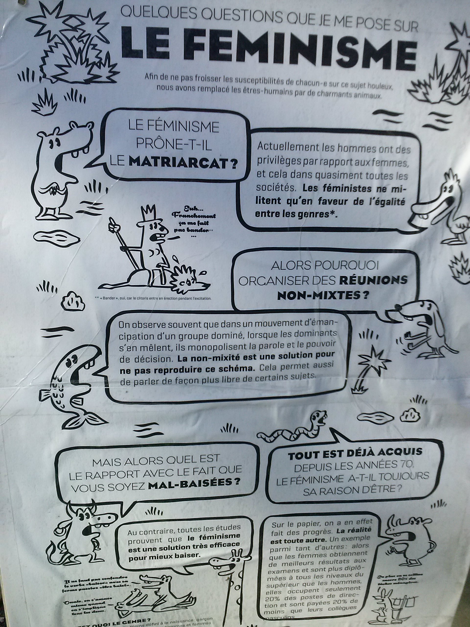Tiens la commission féministe non mixte, mais qu’est ce qu’on peut bien raconter ? je me sens à moitié légitime, du coup j’ose pas y aller voir, c’est un peu violent, non, le coup du fil anti-mecs ? bon je regarde la justification écrite, ok, c’est pour éviter que les mecs prennent la parole plus que les filles… ok j’irai demain si j’ai le courage.