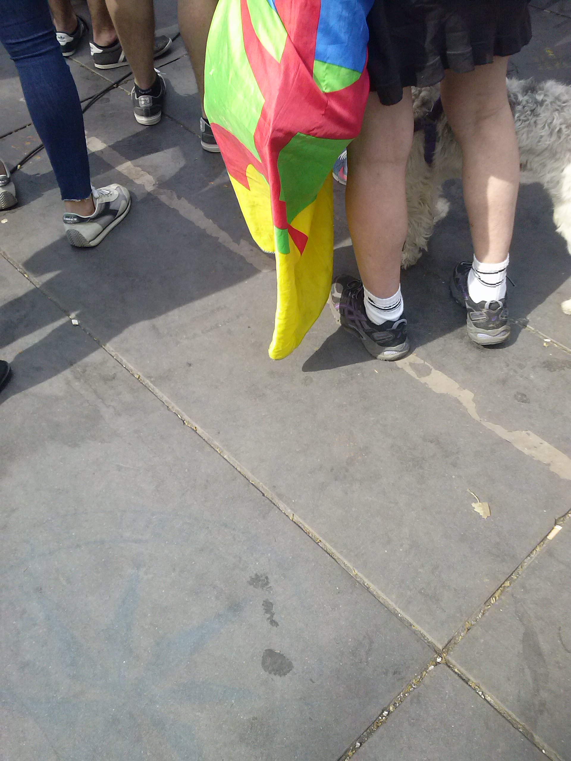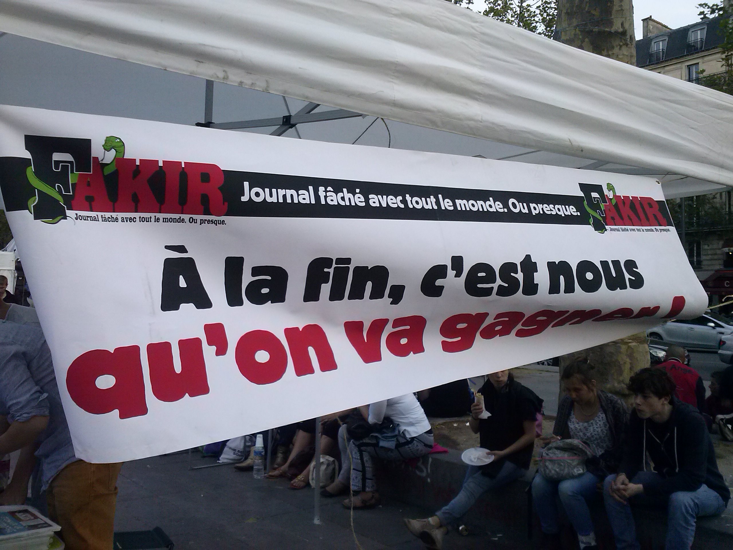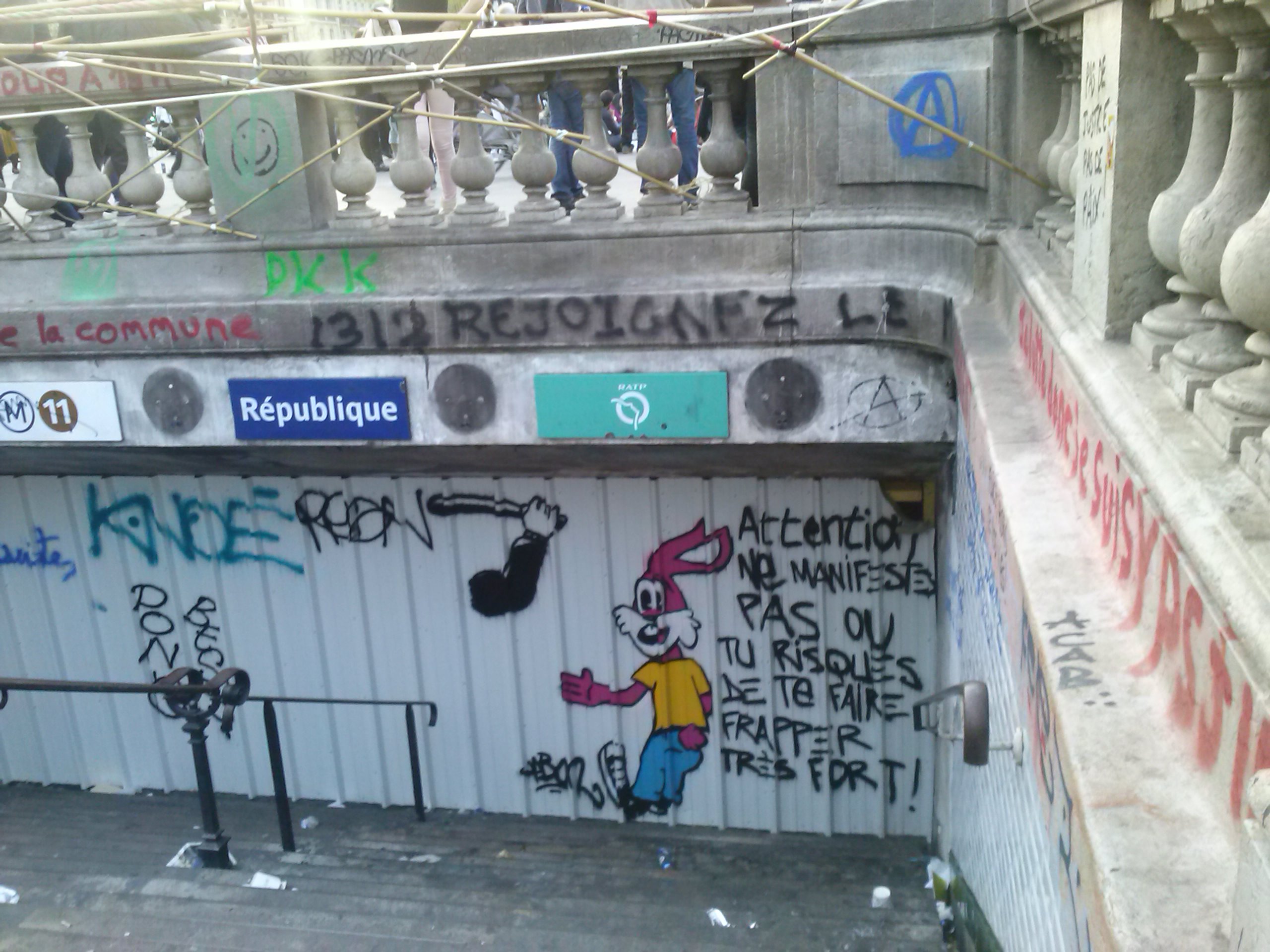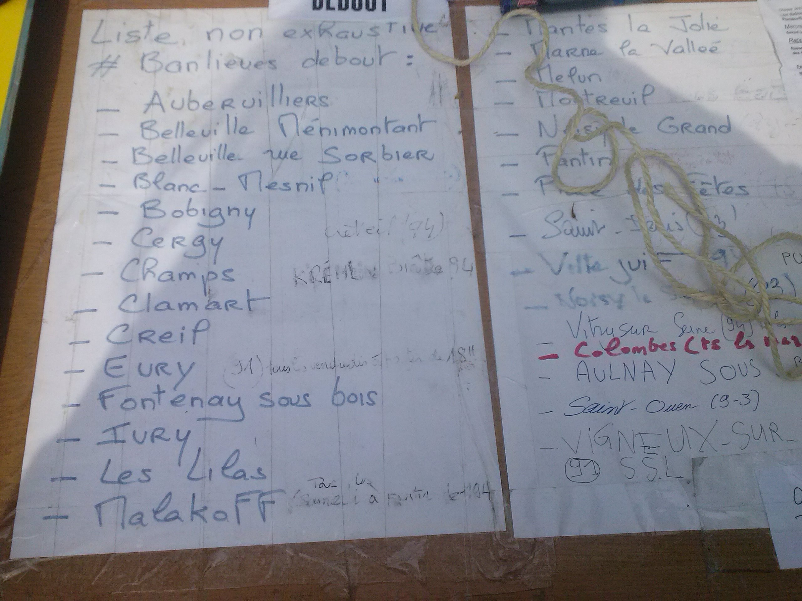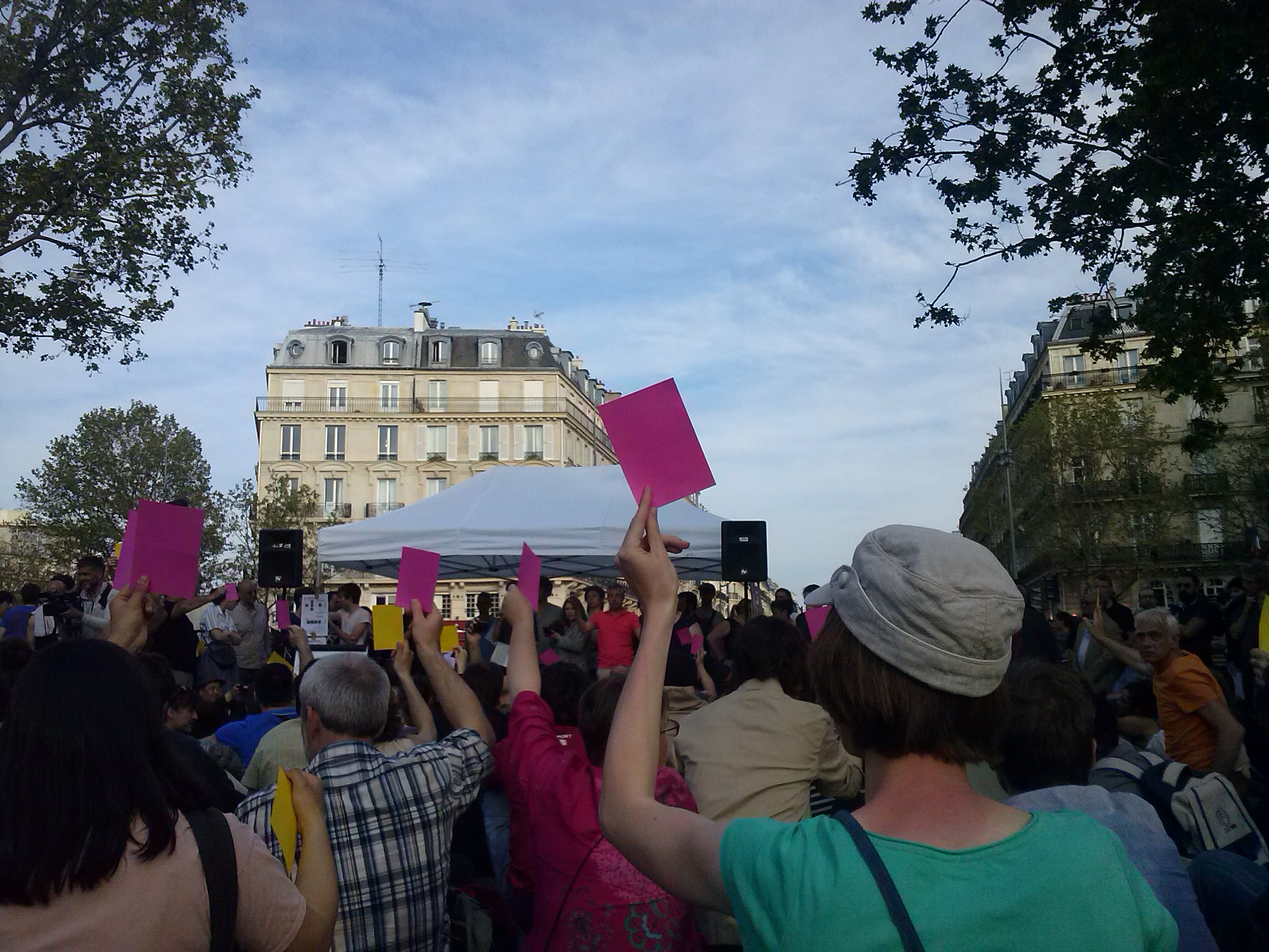 On propose quelque chose pour faciliter la traduction en sourd-muet dans les administration (jaune), un énervé vient nous expliquer qu’on est manipulé par des gens de la comm’ démocratie/vote aguerris et qu’il ne faut pas entrer dans le jeu, « voulez vous qu’il développe ? » dit un des gars de la comm’ : rose général » (= ta gueule !), le relou de tout à l’heure revient en force avec un truc confus sur la loi travail si j’ai bien compris (jaune), une fille vient parler d’intégrer les flics « flics CGT debout » puis se rétracte en disant qu’il ya déjà des discussions en cours, donc finalement bon rien …mais rien, c’est très long-, quelqu’un parle de sanofi et de ce qu’on mange qui est du poison et donc il faut envisager tout via le bien être humain… jaune/rose, et un autre gars propose un amendement à ce vote et du coup même les gens de la comm’ ne savent plus très bien… blanc… entre temps on est interrompus deux fois par des gens qui viennent nous chercher en soutien à une manif dont on a jamais entendu parler qui a dégénéré, des gens se prennent des gaz et des coups à Lourmel. Personne ne se lève, là on fait un truc pardon, et puis c’est quoi cette manif dont convergences des luttes n’a pas parlé ?