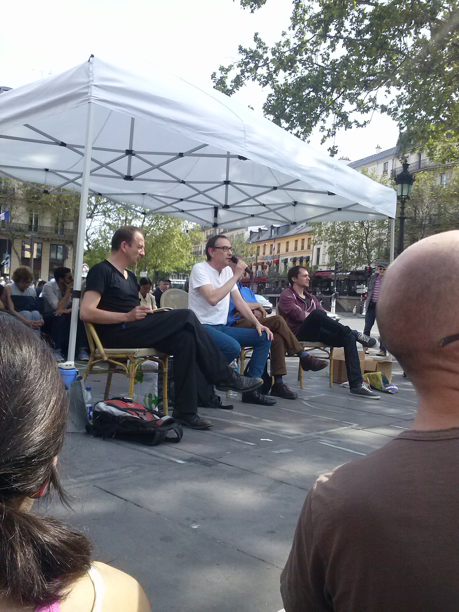 J’attends le débat sur les banques et l’évasion fiscale, on discute avec le mec que j’ai vu en commission violences policières en attendant … on reparle du 18 où des fous de alliance et de la LDJ viendront s’exercer en baston sur des militants. Et on est bien d’accord, il vaut mieux ne pas y être, pourquoi ne pas déplacer la contre manif ? ça fait moins mal et ça montre qu’on est mobiles et indestructibles.