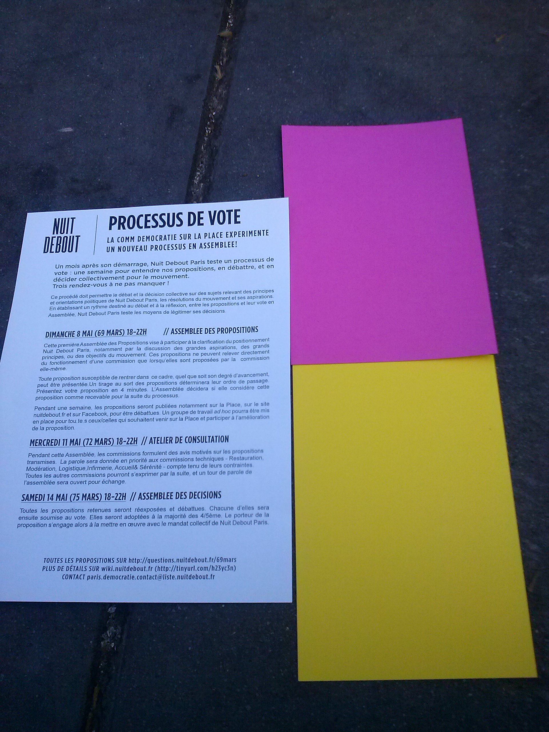 Ensuite on traîne un peu et voilà l’A.G vote test la comm’ explique le principe : proposition de quelques idées (200 papiers récupérés en 5 mn), comme y’en a beaucoup elles sont tirées au sort discutées et votées. Il faut 3 pour vs 3 contre qui exposent pourquoi. Puis on passe au vote général, jaune pour oui et rose pour non.
