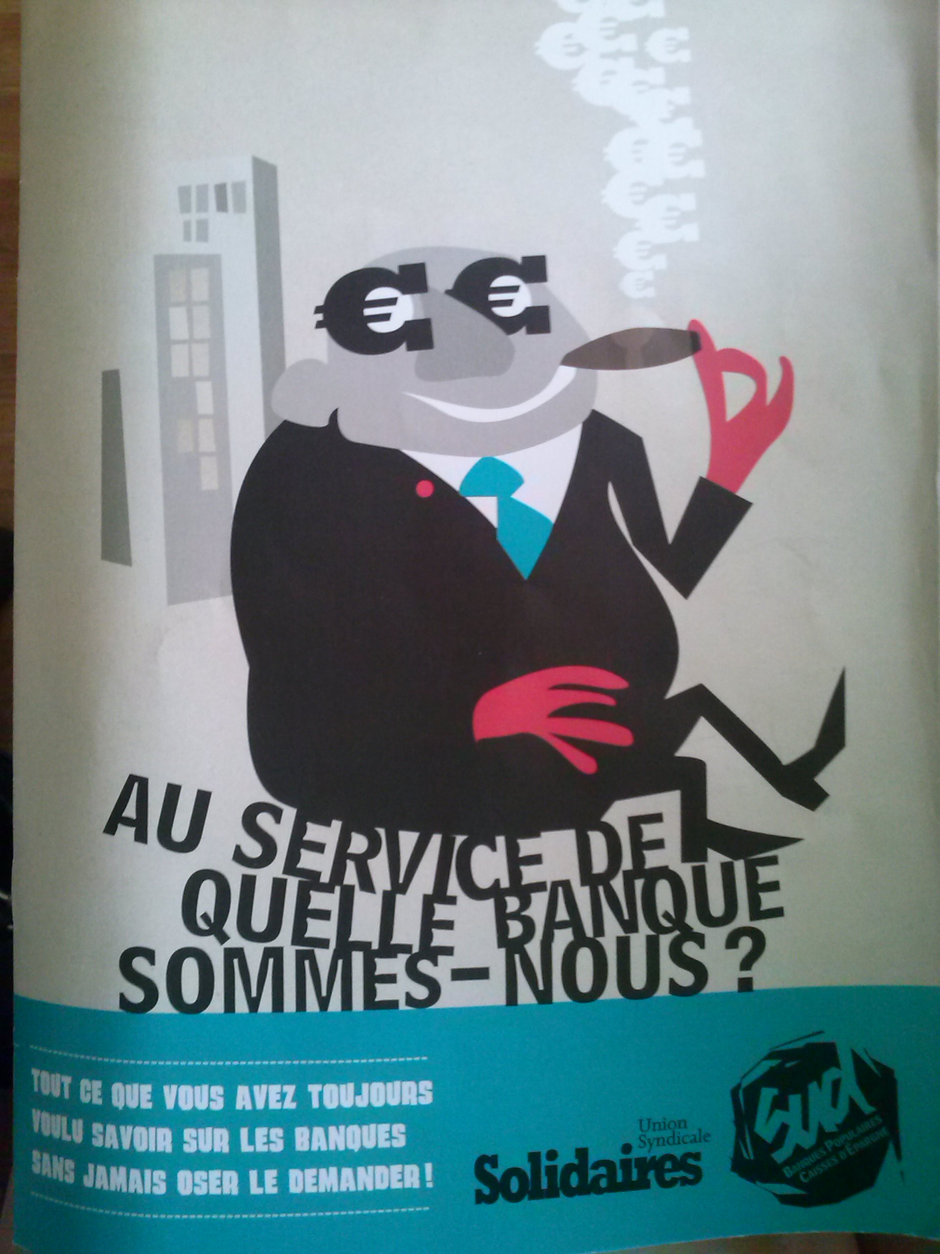 Au débat sur la finance avec des mecs d’Attac, il se dit beaucoup de choses très intéressantes, on a un petit bouquin avec un schéma très parlant avec des gros ronds qui représentent le total des actifs des banques de la zone euro, et des petits ronds (4 fois plus petit) qui représentent la dette des 27 états européens. Tout est dit… les gens demandent comment agir ? on pète les banques ? bon non, on écrit aux agences ? oui proposition retenue, la comm économie va nous faire un modèle ! et la banque postale ? ben elle ne fait pas partie encore des banques impliquées dans l’évasion fiscale, en revanche si t’as un compte BNP, Société Générale, Crédit Agricole, Banque populaire / Caisse épargne, change ton compte. Pourquoi pas le crédit coopératif ?