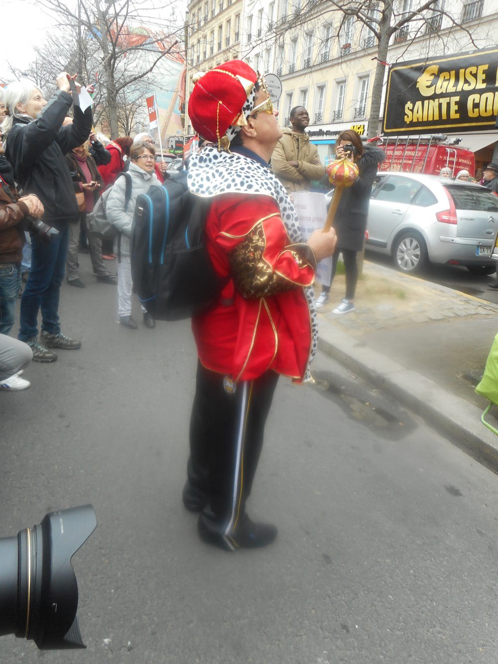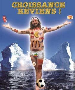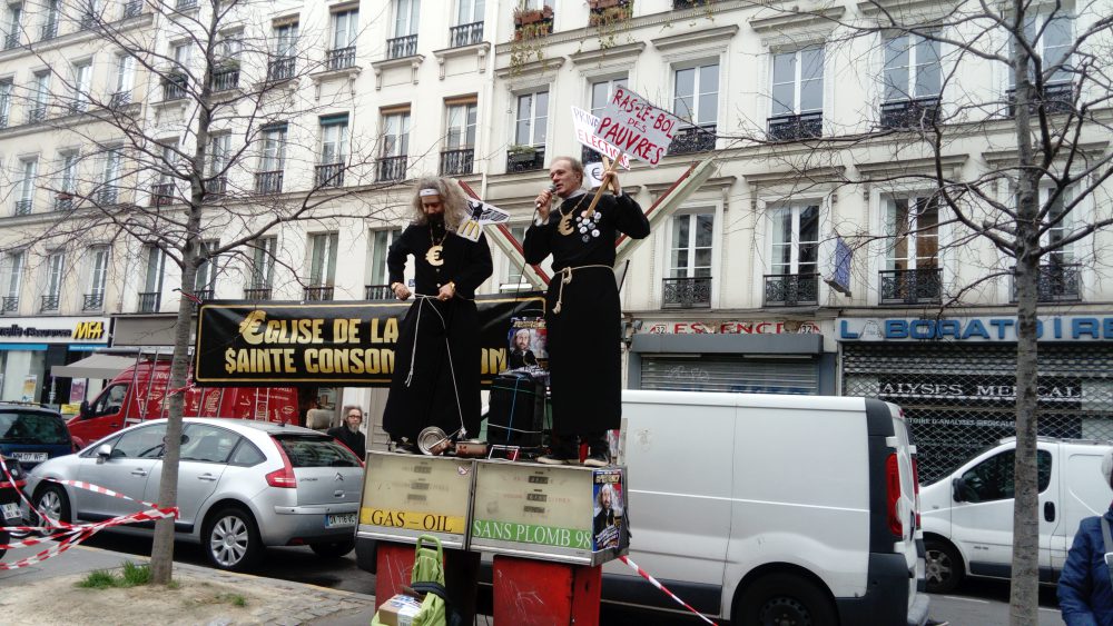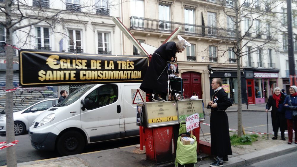 Comme ça ne vient pas vite je flâne dans le boulevard en attendant une copine, et j’arrive juste bien pour un spectacle « croissance reviens ! » Deux gars déguisés en curés avec une ceinture en casseroles se préparent, debout sur les pompes à essence du boulevard du temple. Y’en a un qui tient une sorte de crosse avec un aigle impérial et le M de mac do en dessous, et qui prêche pour un retour rapide « à la sainte consommation « : nous sommes des esclaves, et nous devons nous résigner à bosser pour rien comme la loi travail le