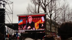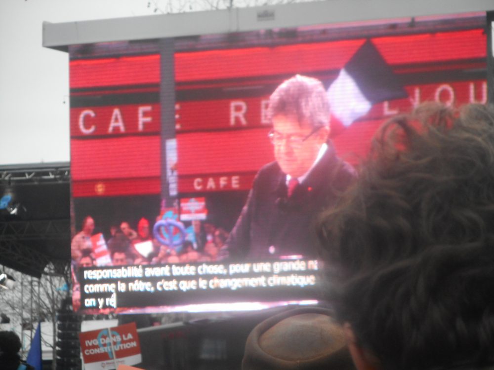 Alors, comme je trouve Mélenchon assez sympathoche, je vais passer le voir à sa marche de la 6ème république. J’ai pas envie de faire la totale, bastille-république, je vais m’avancer un peu dans la manif à l’envers et revenir pour écouter le programme présidentiel plus tard… vers 14 heures à République, la place est entourée de barrières et deux scènes énormes sont installées avec des baffles sur 5 mètres de haut, avec des écrans lumineux géants tout autour. Ils ont cassé la tirelire.