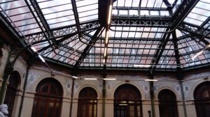 C’est chouette ici un toit en verrière du parquet des bancs en rond autour d’une estrade.