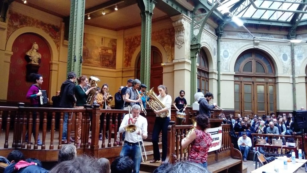 Et comme vers 19 heures, même chose, y’a du monde dans la rue, Ruffin va leur expliquer et leur dire où c’est retransmis, et nous pour patienter on a droit à l’orchestre invisible, celui qui est de toutes les manifs.
