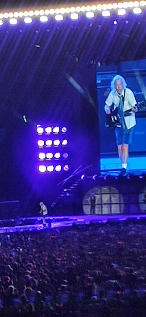 De là où j’étais, (tribunes en bas à l’est si on considère que la scène c’est le nord), les musiciens étaient grands comme une phalange de mon index ou de mon auriculaire -comprenne qui peut- mais avec les grands écrans et le son -qui m’a surpris aussi- c’était carrément bien ! Une playlist de tout que ce que je connais, des musiciens au taquet, un Angus égal à lui même, même la fameuse « duckwalk » de Chuck, il nous l’a faite 4 fois !
