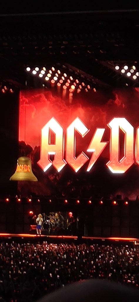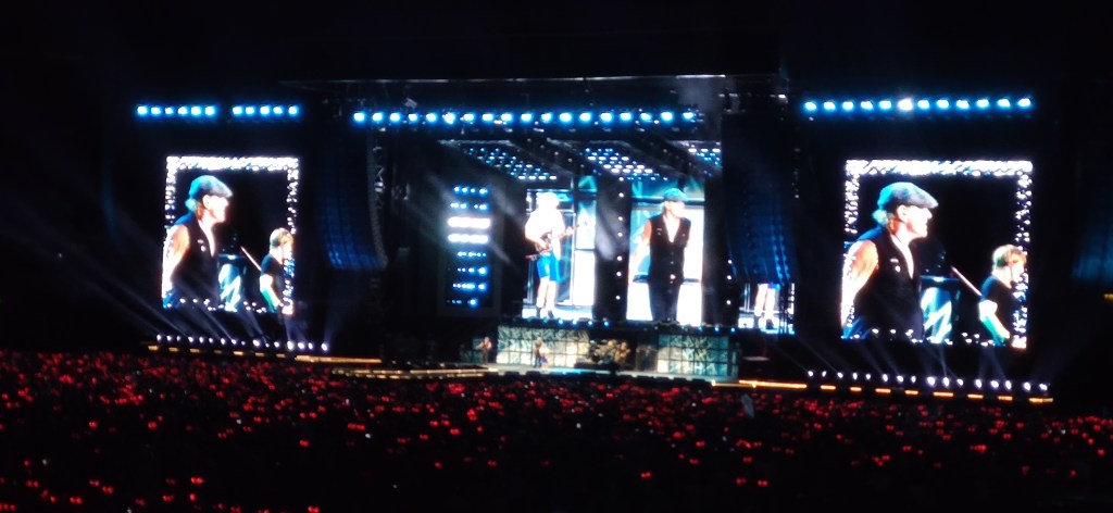 Moi en général je ne vais plus qu’à des concerts à taille humaine, mais j’ai été invitée par Jean, -plus précisément, sa femme Marie, merci Marie!- un vieux copain avec qui on a découvert ACDC autour de nos 12/13 ans, et je dois dire que c’était une bonne idée. Car je pensais qu’ils joueraient les derniers morceaux que je ne connais pas, que l’énergie des 70 ans d’Angus serait moindre, et que la voix de Brian serait usée, que ce serait trop grand et que j’y verrais rien du tout… Que le truc est archi-commercial, et la place très